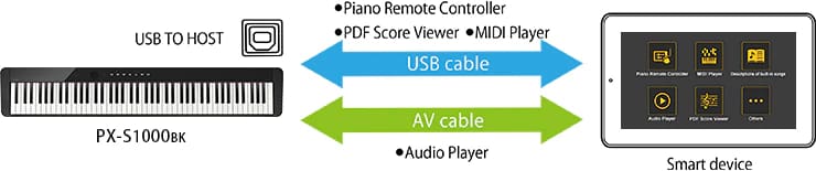 *USB-Kabel und Adapter (separat erhältlich) werden benötigt, um ein Smart-Gerät mit dem Privia zu verbinden. (Auf den Audio-Player kann über Bluetooth-Audio zugegriffen werden.)