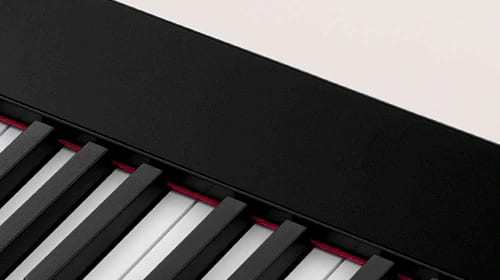 Simulierte Tasten aus Ebenholz und Elfenbein verhindern das Abrutschen der Finger durch Schweiß und vermitteln das Gefühl eines komfortablen Sitzes der Fingerspitzen, der auch bei längerem Spiel anhält.