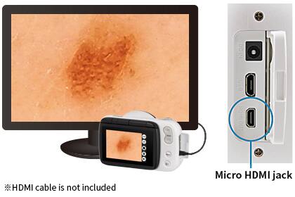 Die Kamera kann über ein HDMI-Kabel an einen großen Monitor oder eine Projektionsleinwand angeschlossen werden, um Bilder in Echtzeit oder später anzuzeigen. Dies ist nützlich für Patientengespräche oder Präsentationen auf einer Konferenz.