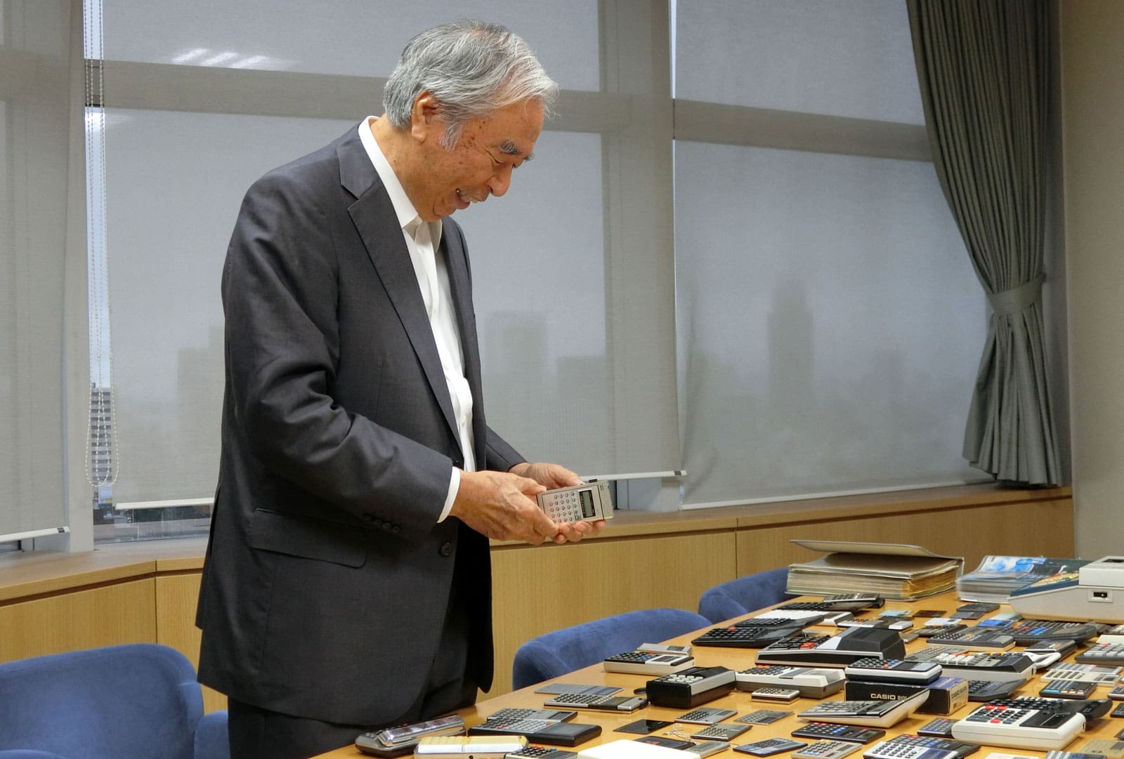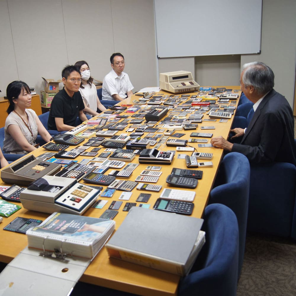 Quando entrei, a Casio já havia progredido para as calculadoras eletrônicas e não estava mais produzindo suas calculadoras de relé anteriores, inventadas por Toshio Kashio. [Toshio Kashio era um inventor e o segundo irmão mais velho entre os quatro irmãos fundadores da empresa. As calculadoras de relé usavam elementos de relé que eram ligados e desligados por meio de eletroímãs]. Ainda assim, tivemos que fornecer manutenção aos nossos clientes de calculadoras de retransmissão existentes. Participei de uma aula sobre isso e vi uma calculadora de relé. Achei incrível! Uma pessoa pensou em um algoritmo e construiu uma calculadora usando relés. O algoritmo usava cálculos de base 2 e base 5, como um ábaco.