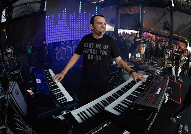 No ano de 2002 foi convidado pelo Harmonia do Samba para ser responsável pelo estúdio da banda onde mais tarde em 2004 seria convidado também a ingressar na banda como tecladista e de lá pra cá foram 3 DVDs, 8 CDs, programas de TV e uma média de 120 shows por ano.