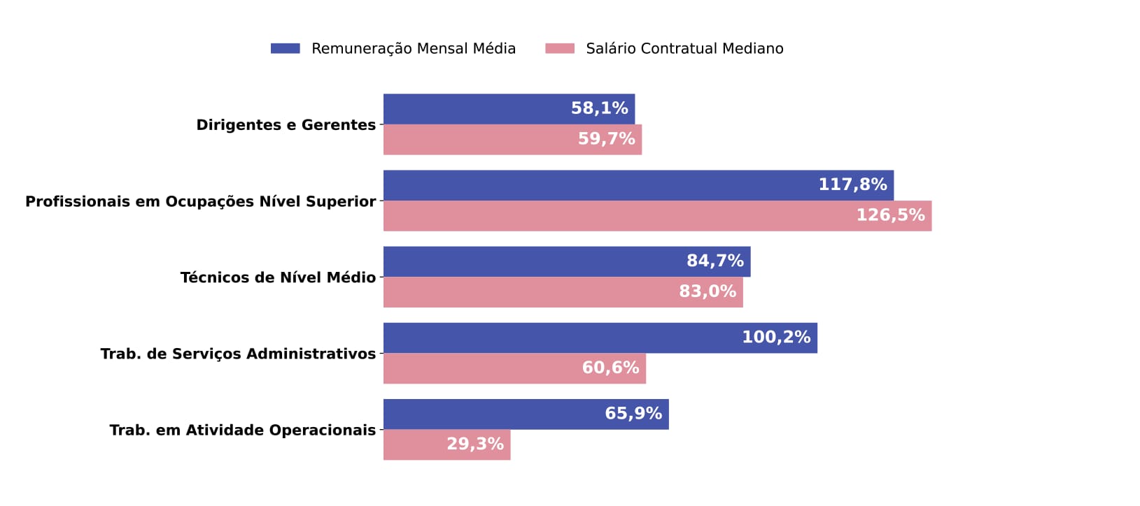 (i) O Relatório apresenta a proporção de Salário Mediano Contratual e Remuneração Média Efetivamente Paga de Mulheres e Homens, segregados pelo Grande Grupo de Ocupações da CBO (Classificação Brasileira de Ocupações), replicando a metodologia utilizada no comparativo geral. Entretanto, as informações compartilhadas pela CASIO com o MTE sobre nossos grupos ocupacionais não foram reproduzidas em sua totalidade no Relatório, desconsiderando a atual estrutura corporativa da empresa.