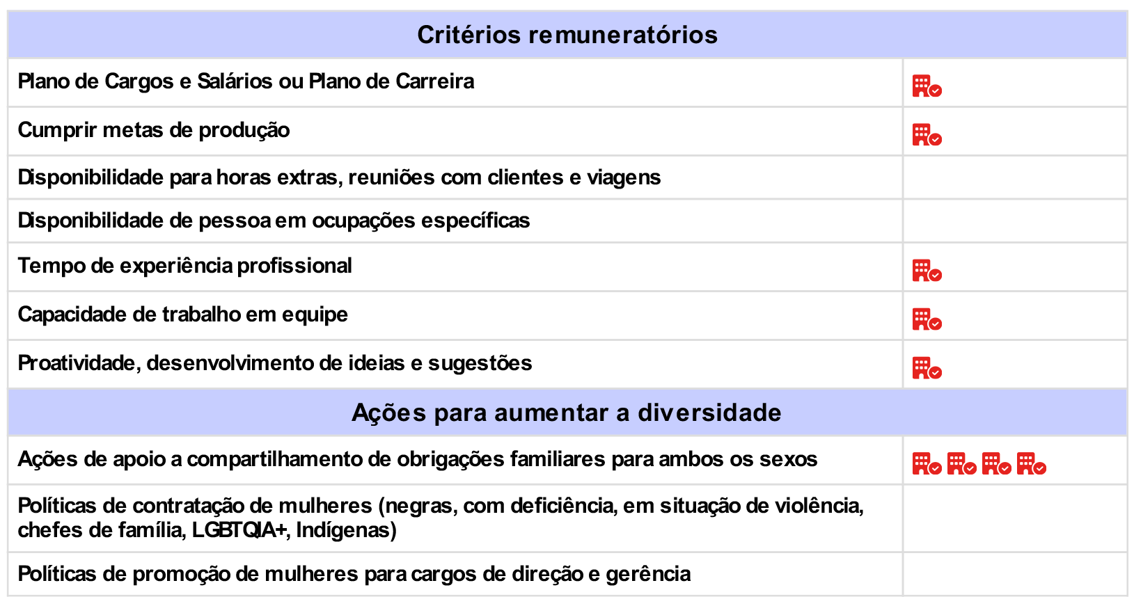 (iii) O quadro de critérios de remuneração e ações para garantir a diversidade (letra “b”) deveria refletir nossas práticas atuais e justificar eventuais diferenças encontradas, nos termos da legislação trabalhista e melhores práticas de mercado. Entretanto, não consta nossa resposta ao questionário, apesar de tê-lo feito, conforme comprovante de envio. Ademais, a empresa implementa diversos programas para garantir a equidade entre homens e mulheres, tais como: atividades de apoio à diversidade, promovendo ativamente a inclusão em todos os nossos processos seletivos, valorizando a representatividade de grupos minoritários; apoio à mãe e mulher, através de ações como o auxílio-creche e Dia da Mulher; incentivo e treinamentos para desenvolvimento de novas lideranças, com o compromisso de aumentar a representatividade feminina em nossos cargos de liderança; instituição de Norma de Gestão de Cargos e Salários, com um plano transparente de cargos, carreira e remuneração a fim de garantir uma progressão de carreira com oportunidade justa e igualitária para todos.