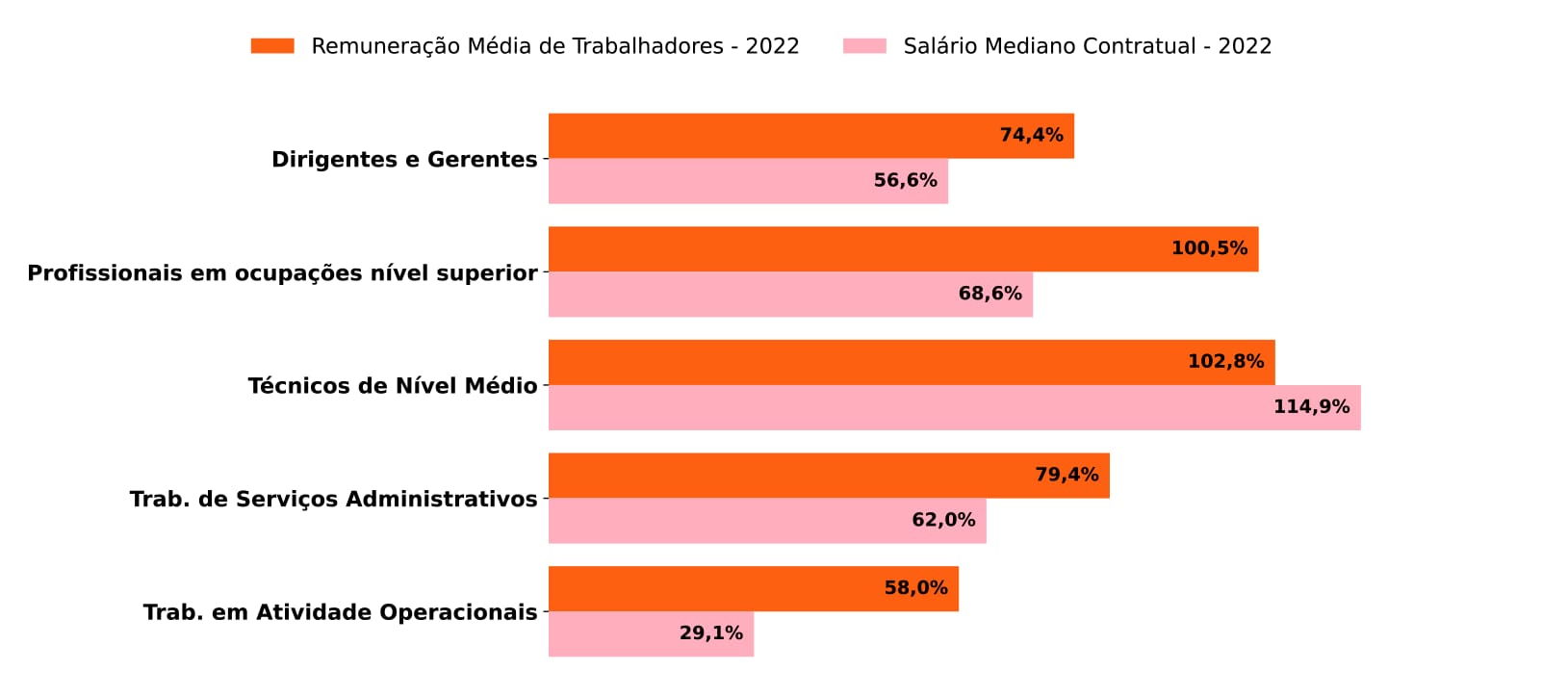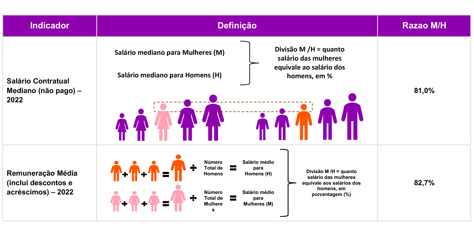 (i) O Relatório apresenta a proporção de Salário Mediano Contratual e Remuneração Média Efetivamente Paga de Mulheres e Homens, segregados pelo Grande Grupo de Ocupações da CBO (Classificação Brasileira de Ocupações), replicando a metodologia utilizada no comparativo geral. Entretanto, as informações compartilhadas pela CASIO com o MTE sobre nossos grupos ocupacionais não foram reproduzidas em sua totalidade no Relatório, desconsiderando a atual estrutura corporativa da empresa.