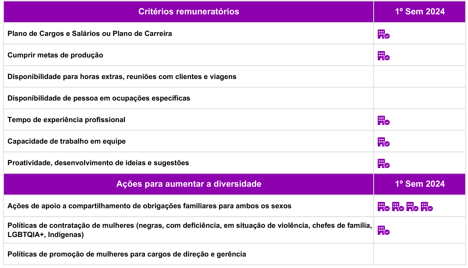 (iii) O quadro de critérios de remuneração e ações para garantir a diversidade (letra “b”) deveria refletir nossas práticas atuais e justificar eventuais diferenças encontradas, nos termos da legislação trabalhista e melhores práticas de mercado. Entretanto, não consta nossa resposta ao questionário, apesar de tê-lo feito, conforme comprovante de envio. Ademais, a empresa implementa diversos programas para garantir a equidade entre homens e mulheres, tais como: atividades de apoio à diversidade, promovendo ativamente a inclusão em todos os nossos processos seletivos, valorizando a representatividade de grupos minoritários; apoio à mãe e mulher, através de ações como o auxílio-creche e Dia da Mulher; incentivo e treinamentos para desenvolvimento de novas lideranças, com o compromisso de aumentar a representatividade feminina em nossos cargos de liderança; instituição de Norma de Gestão de Cargos e Salários, com um plano transparente de cargos, carreira e remuneração a fim de garantir uma progressão de carreira com oportunidade justa e igualitária para todos.