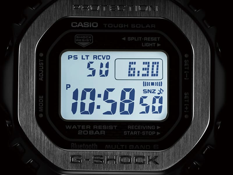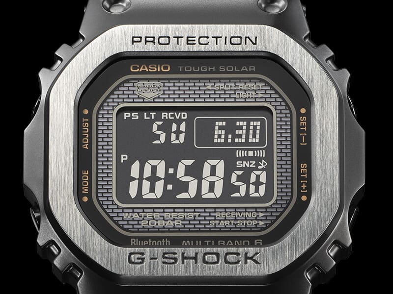 A moldura e a pulseira de aço inoxidável recebem galvanização iônica preta em um tom mais claro do que a galvanização iônica preta convencional (do GMW-B5000GD-1).