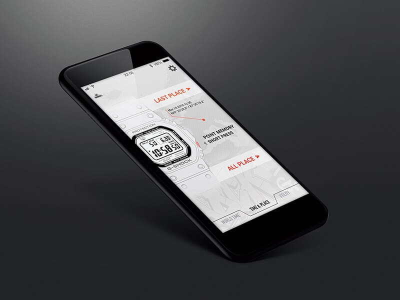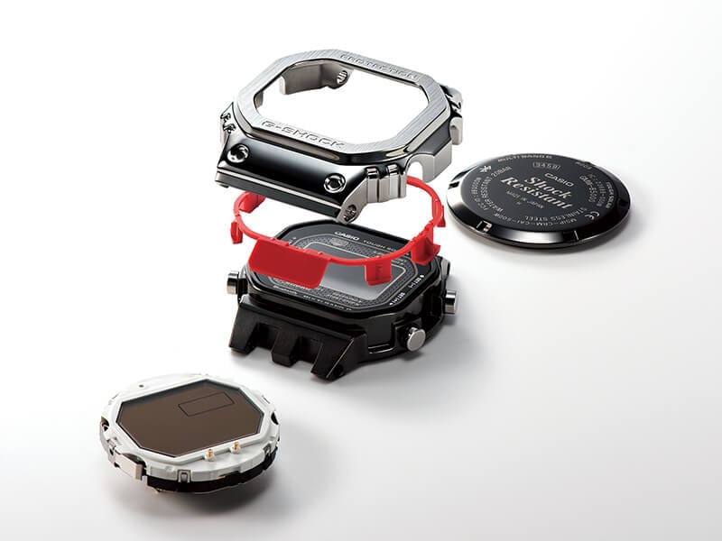 Feitos de resina fina, componentes amortecedores que compõem a estrutura resistente a impactos são instalados entre a caixa e a moldura em aço inoxidável. Com seu exterior metálico advindo do formato original do primeiríssimo G-SHOCK, o relógio aproveita ao máximo o potencial de sua estrutura resistente a impactos.