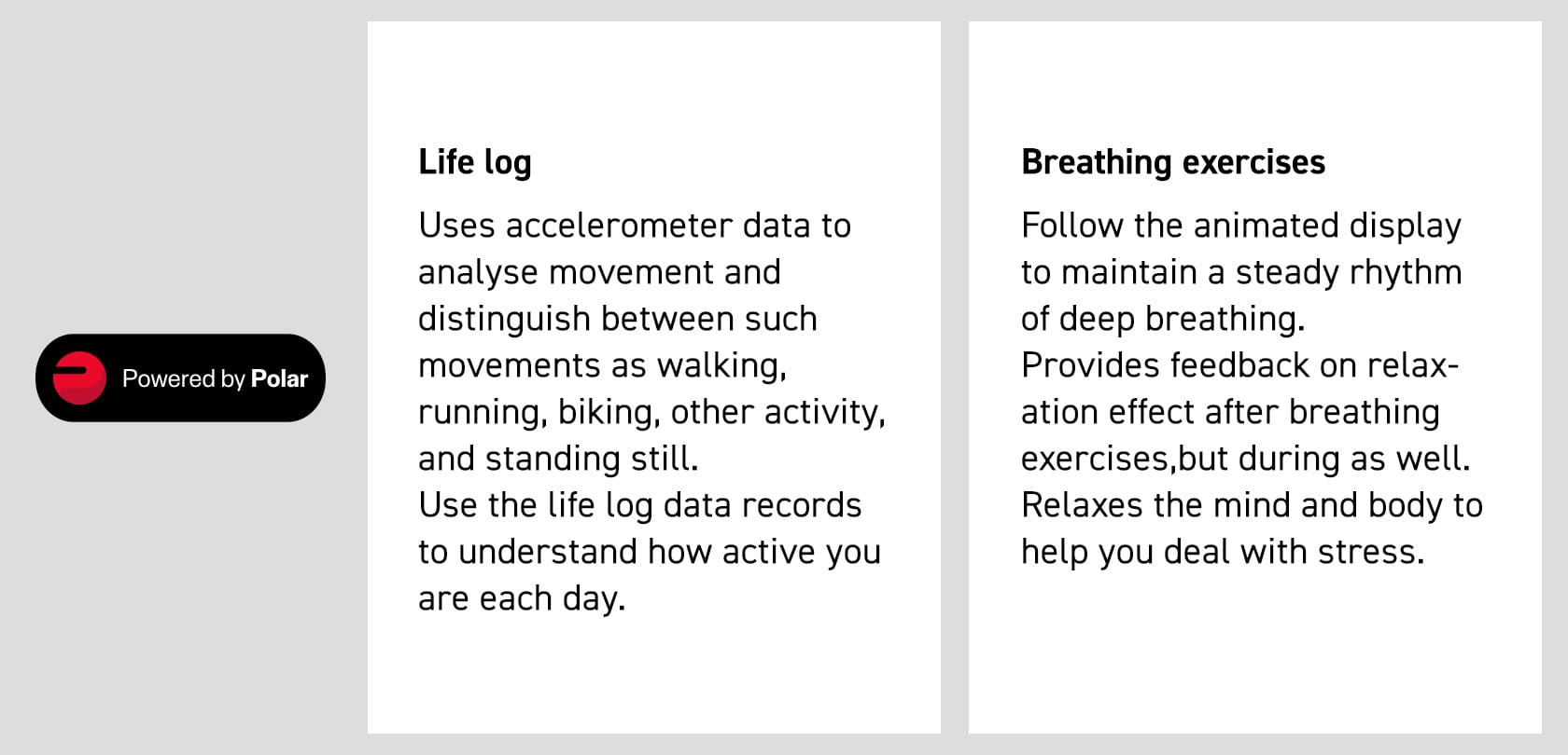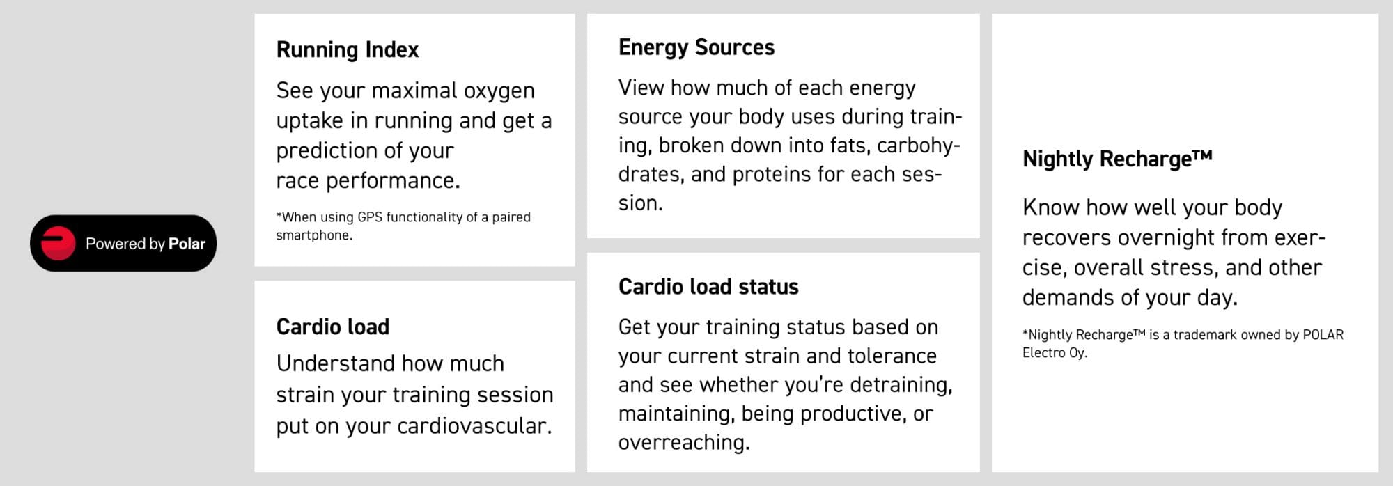 Saat tarafından toplanan vücut verileri temel alınarak, mevcut performansınız ve durumunuz anlaşılması kolay bir biçimde görüntülenir. Veri analizleri için, Polar'ın sınıfının en iyisi algoritmaları ve rehberlik teknolojisi ile desteklenen bir antrenman ve kurtarma özellikleri setini kullanıyoruz. Vücudunuzun durumuna göre uyarlanmış araçları kullanarak, antrenman çalışmalarınızı hassas şekilde ayarlayabilir ve performansınızı en üst düzeyde tutabilirsiniz. İster koşu ister bisiklet sürme ister yüzme olsun; bu saatler sevdiğiniz her spor için tam donanımlı temel ekipmanlardır.