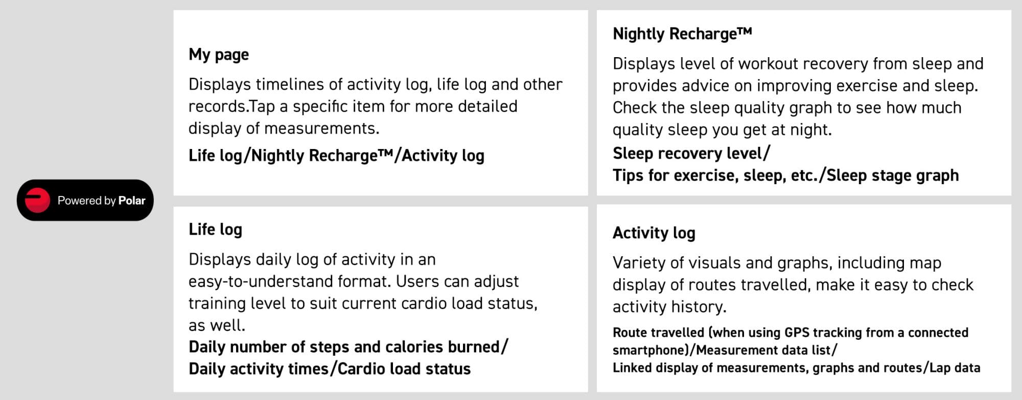Saatin izlediği verileri kolayca yönetmek için uygulamayı kullanın. Motivasyonunuzu korumak ve kendinize en uygun şekilde egzersiz yapmak için günlük etkinlik günlüklerini, antrenman durumunu ve diğer bilgileri kolay anlaşılır şekilde görüntüleme avantajından yararlanın. Egzersiz performansının ve sağlığa öncelik veren yaşam tarzının iyileştirilmesine yardımcı olur.