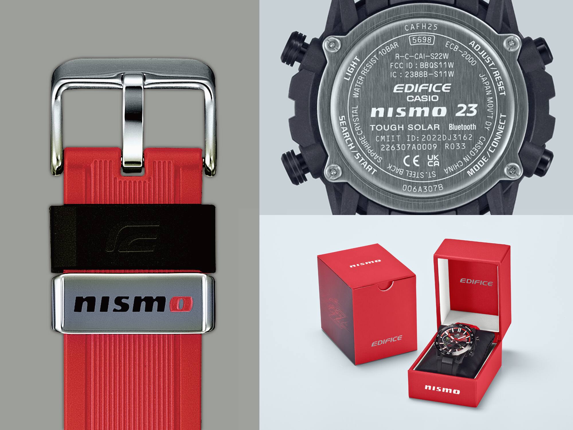 Metal kordon halkası, NISMO logosuyla süslenmiştir. Arka kasaya hem EDIFICE hem de NISMO logoları ve ikonik yarış arabasının tanımlayıcı numarası "23" işlenmiştir. Saat, kırmızı ve siyah takım renklerini gururla sergileyen özel bir ambalaj içinde gelir.