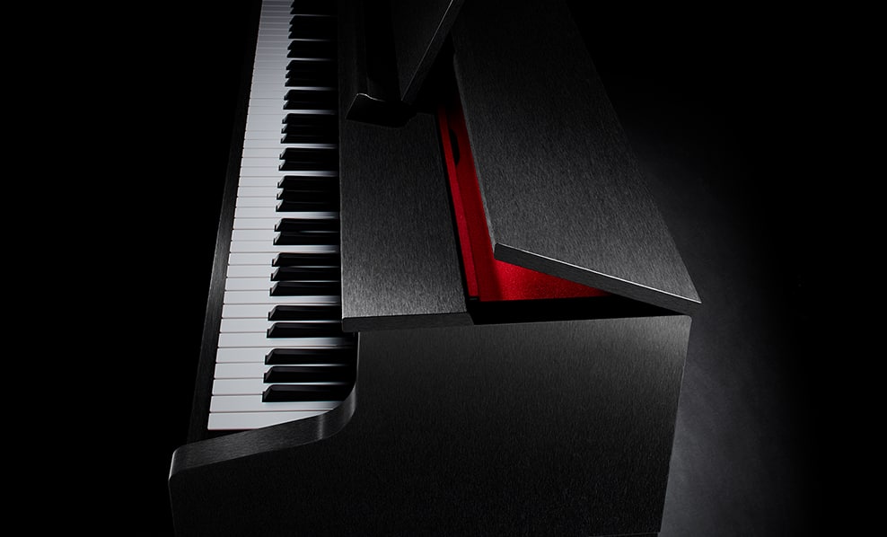 Además, el simulador de tapa integrado reproduce los efectos acústicos de las diferentes posiciones de la tapa del piano de cola. Los cuatro grados de apertura seleccionables permiten influir de forma específica en la intensidad o suavidad del sonido, según las preferencias personales.