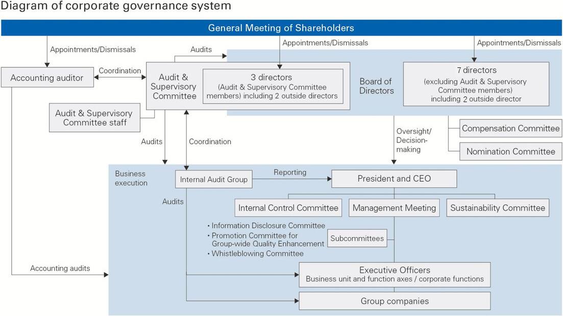 To promote sustainable growth and medium- to long-term improvements to our corporate value, we position swift decision-making, the proper performance of duties, and strengthening our management oversight functions as core issues for the Company. To ensure appropriate responses to these issues, we are strengthening the Board of Directors’ oversight functions. To accelerate and optimize business execution based on appropriate supervision by the Board of Directors, with a resolution passed on June 27, 2019 at the General Meeting of Shareholders, we switched to a company with an Audit & Supervisory Board to a company with an Audit & Supervisory Committee structure. Currently, the Board of Directors has 10 members, with at least one-third of the seats reserved for outside directors to strengthen its oversight function.