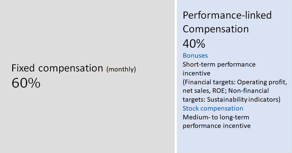 To give greater emphasis to performance-linked compensation, the relative weights of the compensation components are set at 60% for fixed compensation and 40% for performance-linked compensation (of the performance-linked compensation, 25%consists of bonuses and 15% of stock compensation). However, these proportions may be adjusted according to the individual role.