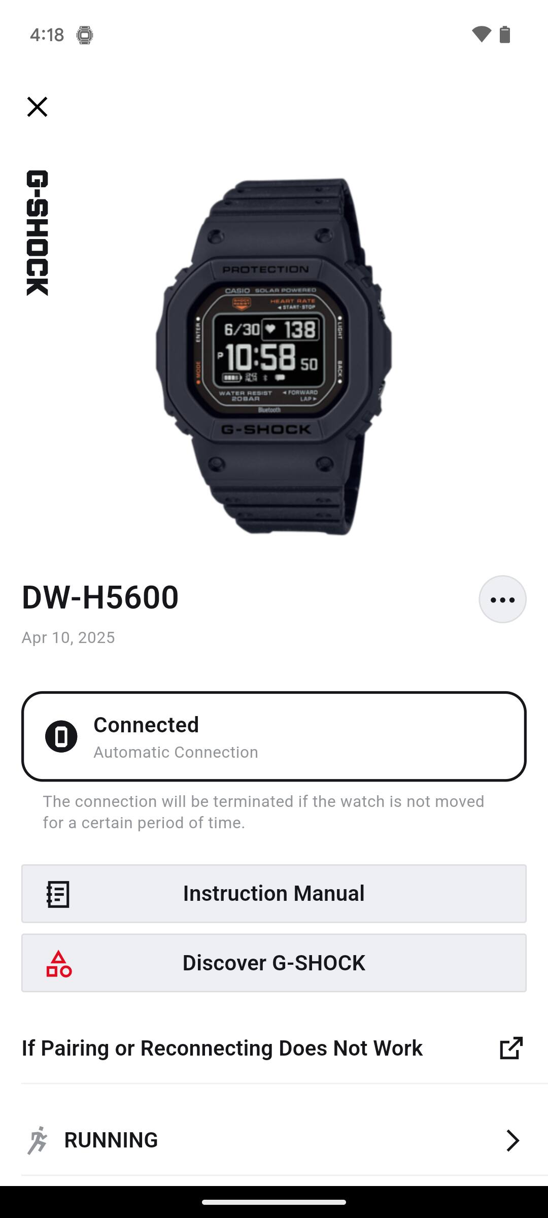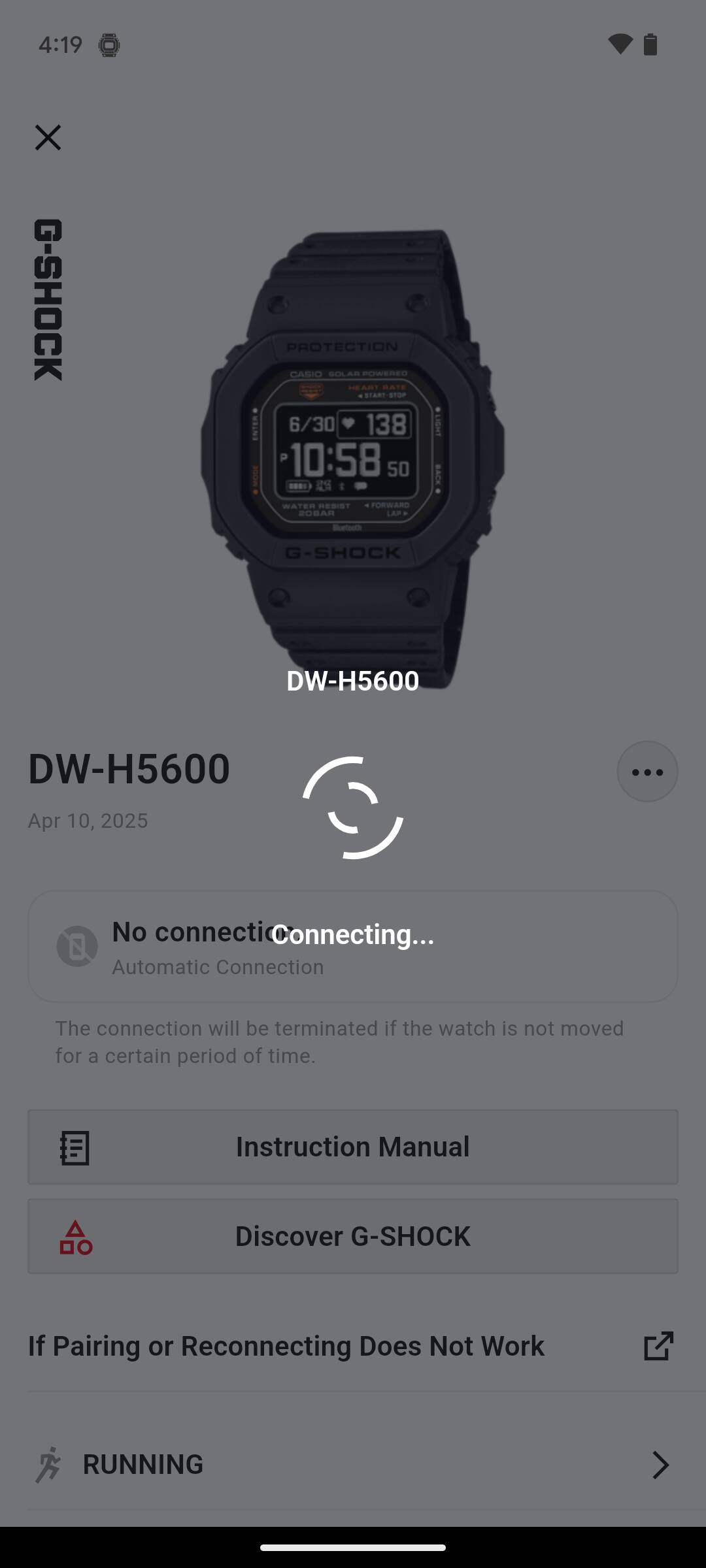 If the watch remains stationary for a certain period, the connection will be terminated and automatically reconnect when the watch is moved.