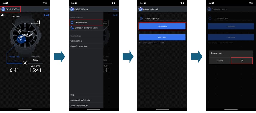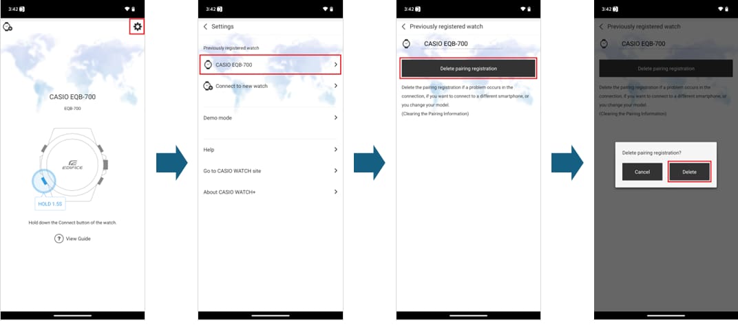 1. Delete the pairing information in the "CASIO WATCH+" app.