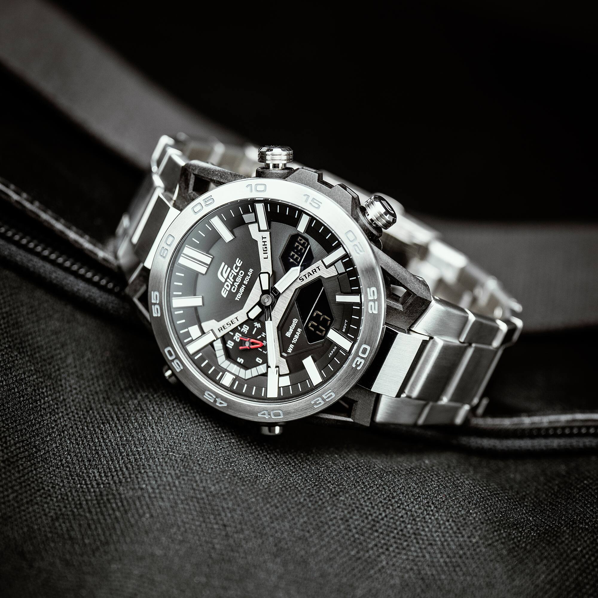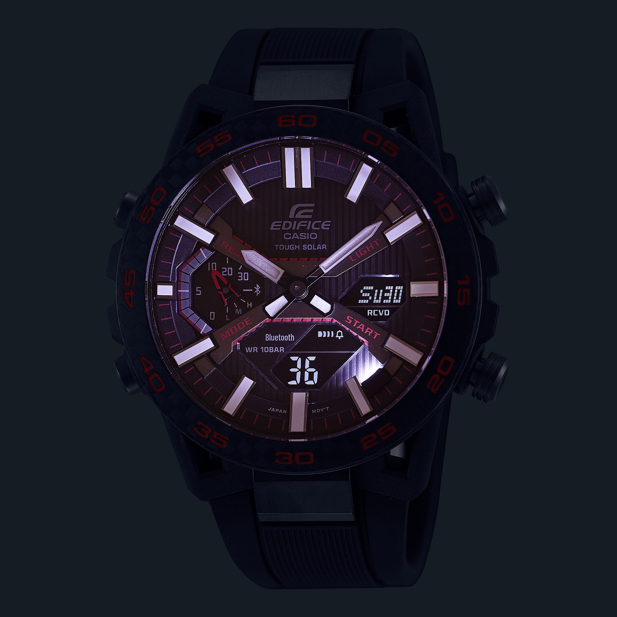 The new watch is available in three versions. The ECB-2000PB employs a soft urethane band for an extremely comfortable fit on the wrist, while the ECB-2000D and ECB-2000DC feature a sophisticated textural appeal with stainless-steel bands. The ECB-2000 embodies a motorsports worldview with a design that evokes the sharp image of a formula race car.