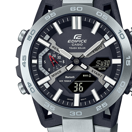 The ECB-2000 uses the Tough Solar charging system, which converts light from fluorescent lamps and other sources to power the watch, as well as Mobile Link functions usable by pairing via Bluetooth® with a smartphone. When used with the dedicated CASIO WATCHES app, the watch automatically adjusts the time. The app also enables configuration of world time with the smartphone as well as transfer and display of stopwatch data measured on the watch, all of which are features that provide support for racing activities.