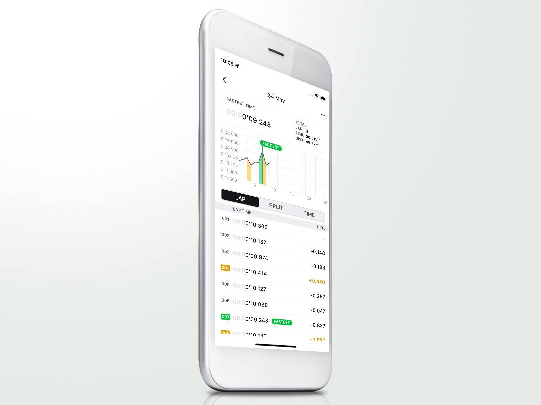 - 秒錶資料傳輸:以毫秒為單位顯示圈速時間。查看圈速時間差異和最快時間,一目了然。