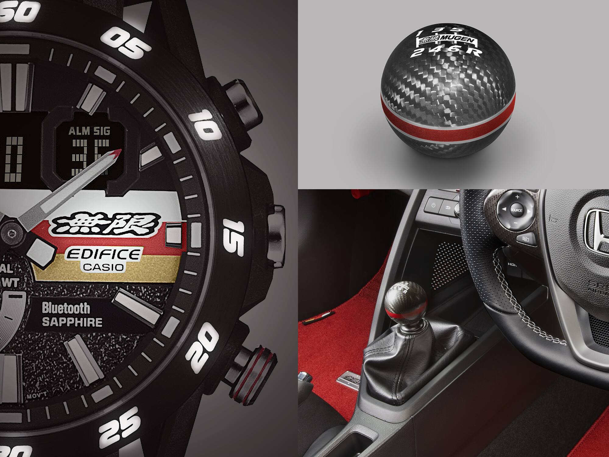 展示 MUGEN 與 EDIFICE SOSPENSIONE 的聯乘之作。正慶祝成立 50 週年的 MUGEN 是一個仍處於賽車世界前線的領導品牌,而 EDIFICE SOSPENSIONE 是一款誕生於「真正的賽車運動」概念的手錶。這款手錶大力喚起 MUGEN 果敢的賽車精神,在其設計的各方面(包括顏色、標誌和徽章)體現了品牌的特色。錶帶採用 Alcantara 製成,這種精緻的材料亦因用於高端汽車內飾而聞名。這款優質時計手錶絕對適合慶祝這個特殊的週年紀念。