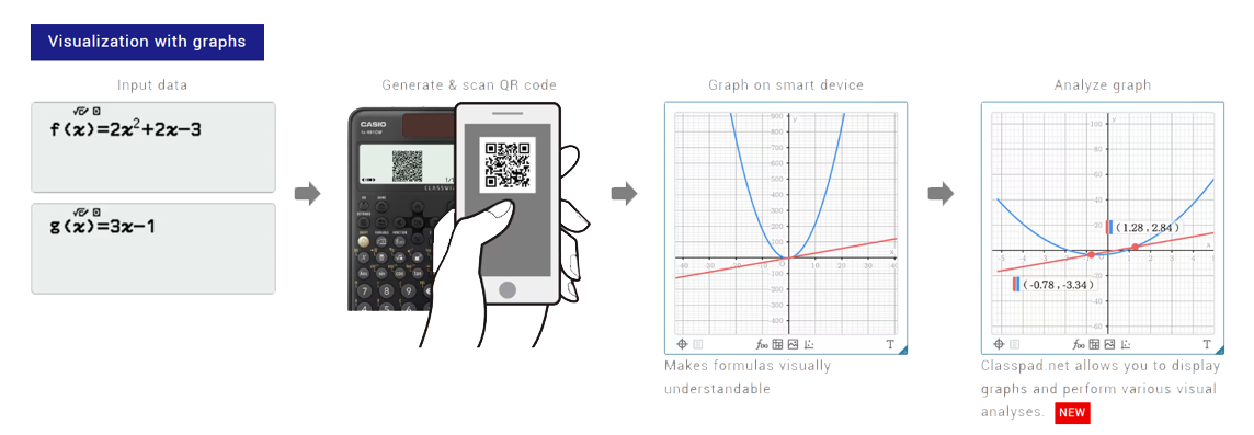 Fitur unik ClassWiz adalah kemampuannya untuk menghasilkan dan menampilkan kode QR untuk persamaan yang dimasukkan dengan operasi sederhana. Kode QR ini memungkinkan Anda untuk dengan mudah melihat grafik dan data relevan lainnya atau informasi di ponsel pintar atau tablet Anda. Fitur ini menawarkan cara mudah untuk mengakses dan berbagi perhitungan Anda saat bepergian.