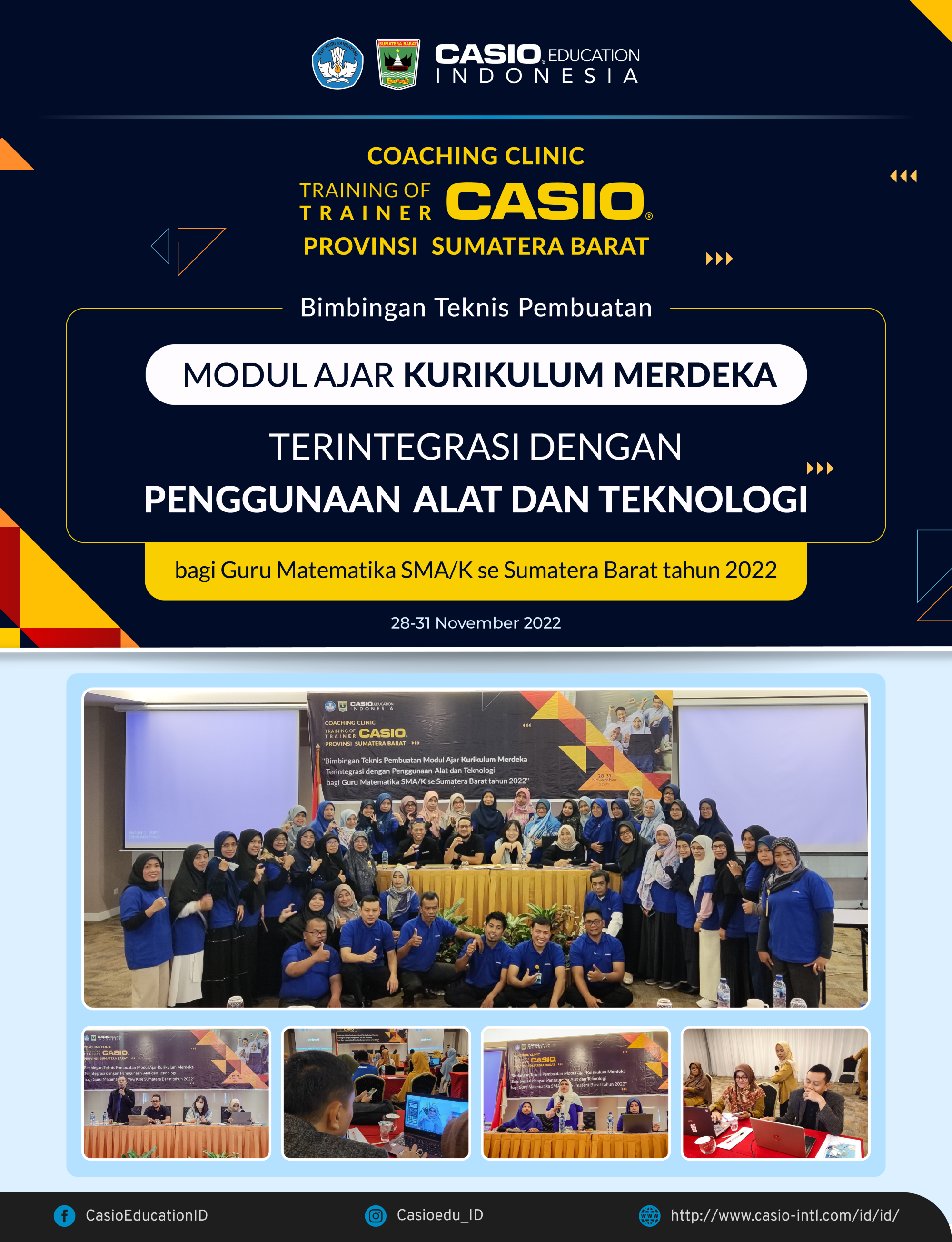 Hal ini bertujuan untuk mengoptimalkan peserta didik memiliki cukup waktu untuk mendalami konsep dan meningkatkan kompetensi dalam Kurikulum Merdeka, sehingga guru memiliki keleluasaan untuk memilih berbagai perangkat ajar sehingga pembelajaran dapat disesuaikan dengan kebutuhan belajar dan minat peserta didik. Dimana hal ini menjadi bagian dari kebutuhan bagi guru – guru di Provinsi Sumatera Barat, untuk mendapatkan pemahaman yang lebih dalam terkait bagaimana cara pembuatan dan pengembangan modul ajar yang menggunakan kurikulum merdeka. Untuk itu, Dinas Pendidikan Provinsi Sumatera Barat dan CASIO Education Indonesia melakukan coaching clinic (refreshment training) untuk trainer CASIO di Provinsi Sumatera Barat yang sudah bergabung sejak tahun 2019. Kegiatan ini dilaksanakan pada tanggal 28 – 30 November di Hotel Grand Zuri, Kota Padang dan diikuti oleh 46 peserta dari total 78 trainer.