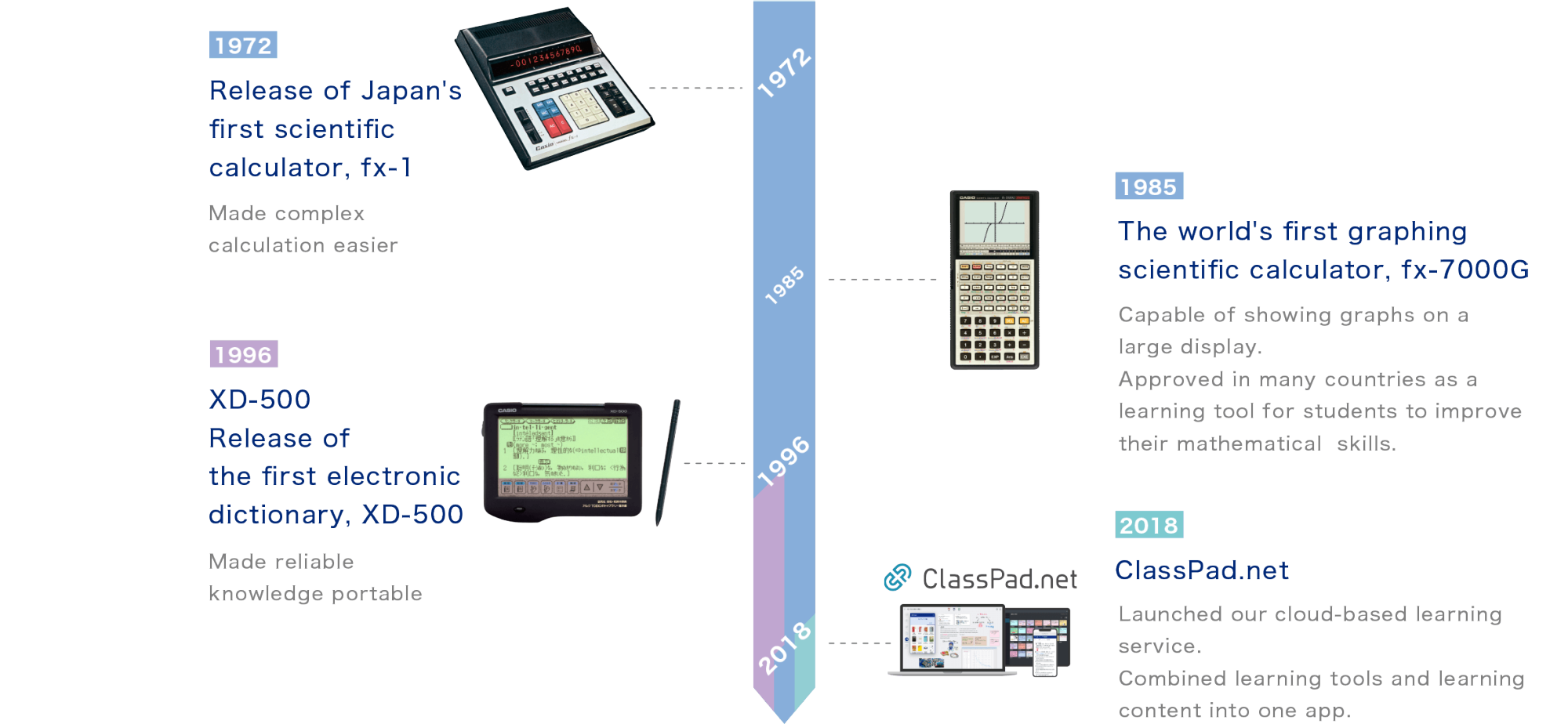 Di tempat pembelajaran, kami di CASIO menempatkan diri di posisi Anda, baik ketika Anda belajar saat ini maupun di masa depan, serta mengembangkan produk berdasarkan teknologi unik dengan kesadaran akan tujuan dan ide-ide orisinal yang kuat.