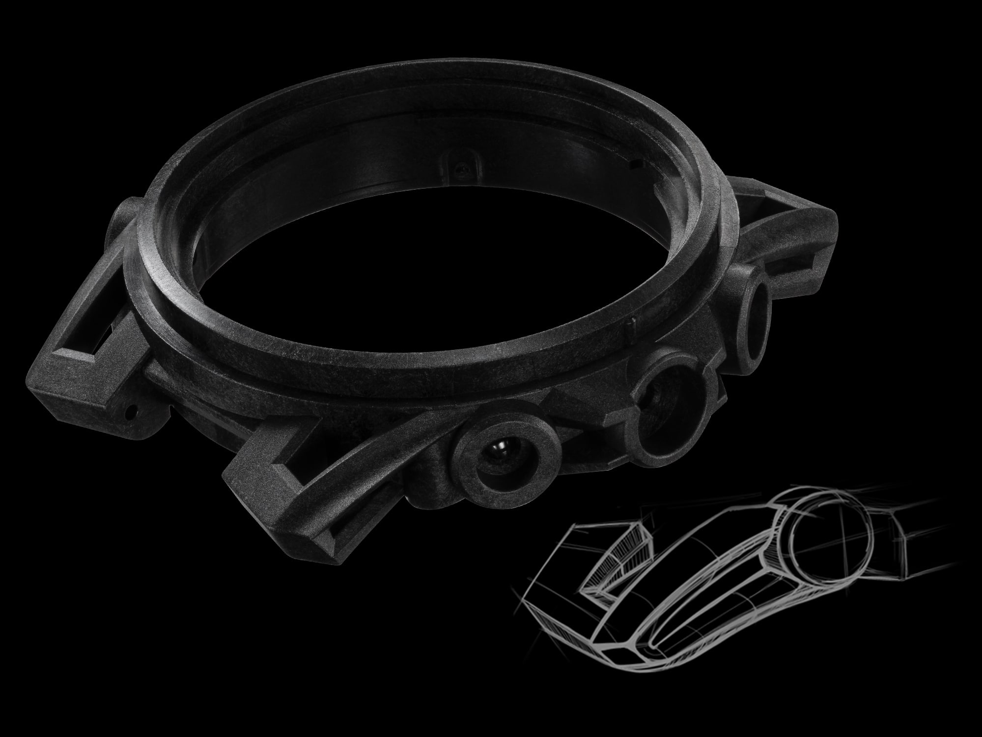 Terinspirasi oleh suspensi double wishbone yang digunakan pada mobil balap dengan sepasang lengan bercabang pada bagian atas dan bawah, lug yang menghubungkan tali jam dengan casing menampilkan pengaturan empat lengan. Resin yang diperkuat serat karbon digunakan untuk bahan casing, menawarkan daya tahan tinggi dan bobot yang ringan.