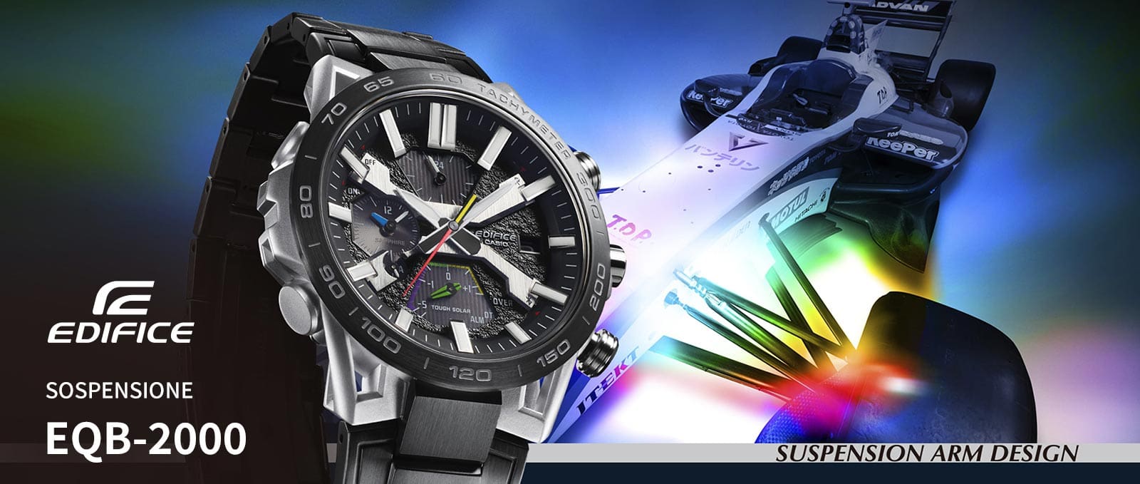 Memperkenalkan bentuk, fungsi, dan kecanggihan motorsport sejati dalam kronograf EDIFICE unggulan, SOSPENSIONE EQB-2000. EDIFICE Speed & Intelligence dilengkapi inovasi dan teknologi berkinerja tinggi, dengan konfigurasi lug empat lengan yang terinspirasi dari suspensi wishbone ganda empat lengan pada mobil balap formula. Komponen tombol dial memiliki kode warna layaknya setir mobil balap sehingga mudah dilihat. Jarum detik berwarna merah memberi visibilitas luar biasa yang diperlukan tim balap karena setiap detik amatlah berharga. Bezel dan tali jam berlapis ion serta kristal safir menjadikan jam tangan tahan gores dengan tampilan dan nuansa mobil balap. Mudah disinkronkan dengan smartphone melalui Bluetooth®. Buka aplikasi untuk mengakses beragam fungsi krusial bagi tim balap — menyesuaikan waktu otomatis secara presisi hingga ke detik, mengelola waktu dunia dengan mudah, dan mentransfer data stopwatch yang dihitung hingga milidetik sebanyak hampir 200 waktu putaran ke smartphone Anda. Tough Solar dapat mengisi daya jam tangan dari sinar matahari atau bahkan lampu neon, menyimpan cukup daya untuk penggunaan normal selama 5 bulan.