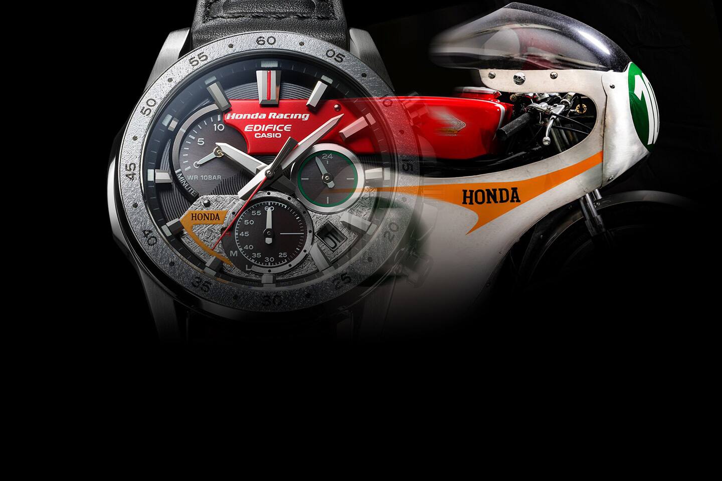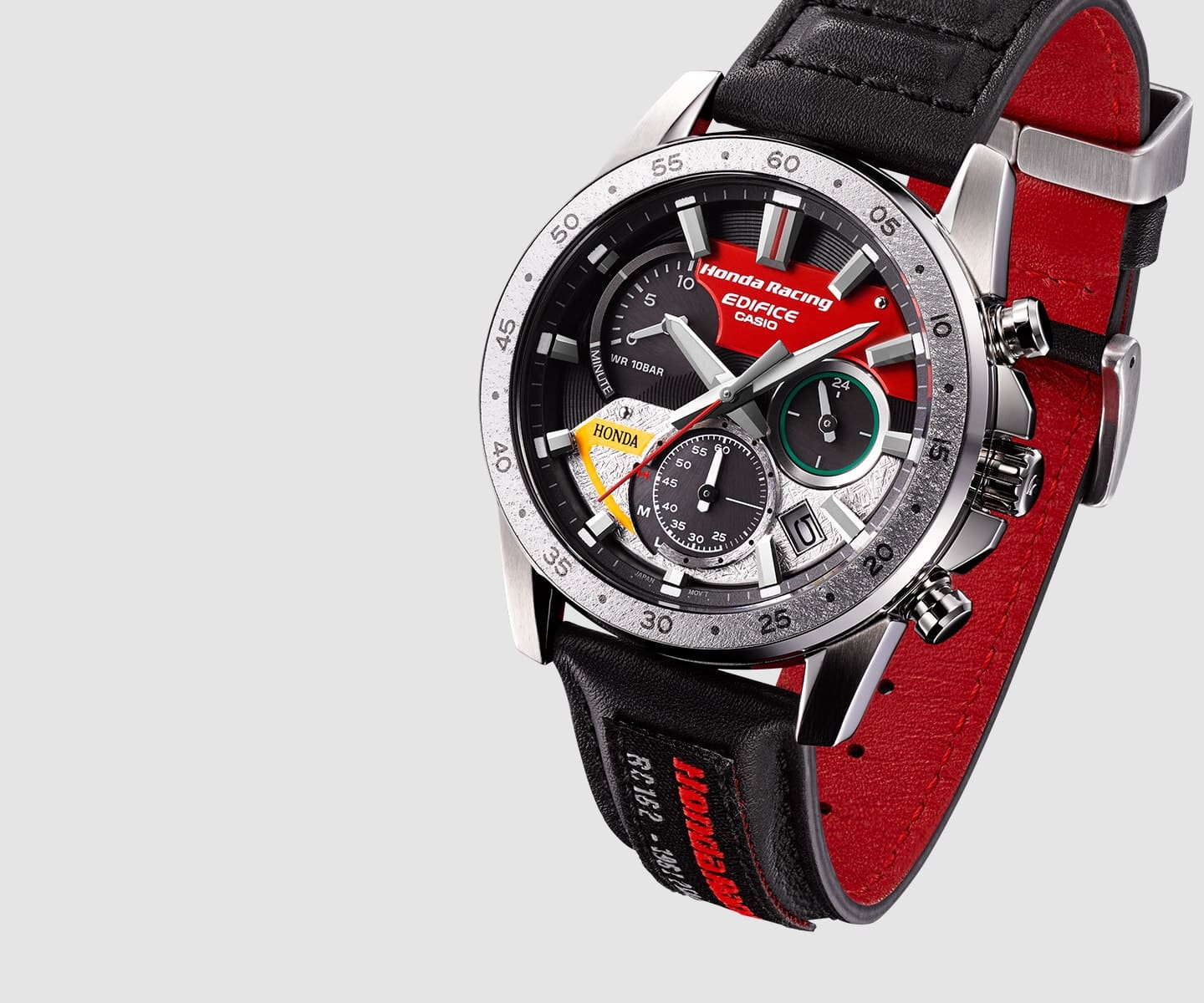 EDIFICE dan Honda Racing berkolaborasi untuk menciptakan kronograf bertenaga surya yang terinspirasi dari sepeda motor balap juara dunia Grand Prix pertama Jepang. Seri Honda Racing Edisi Terbatas ini memberikan penghormatan kepada motor RC162 legendaris yang berhasil menaklukkan dunia. Bergabunglah dalam perayaan hari jadi ke-60 kemenangan bersejarah Honda pada tahun 1961 dengan penunjuk waktu yang mempersembahkan penghargaan bagi sepeda motor juara dunia pertama di Jepang. Bezel dan dial aluminium diproses secara khusus sesuai dengan fairing aluminium yang dipalu pada sepeda motor ini — dan diberi aksen warna merah tangki bahan bakar motor serta warna kuning fairing motor. Tali jam tangan kulit asli pada jam ini menghadirkan logo dan baju balap Honda tahun 60-an, dan logo Honda Racing ditampilkan di dial, ikatan tali jam tangan, dan casing belakang.