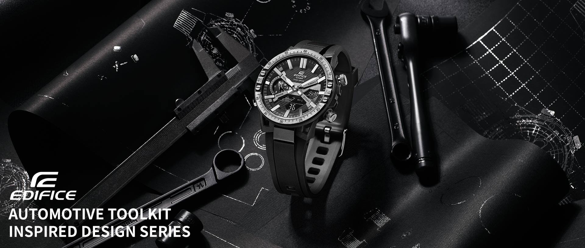 Toolkit profesional yang menjadi bagian penting dari kehidupan para penggemar otomotif menginspirasi konsep desain untuk jajaran produk baru yang istimewa ini. Proses pelapisan dan pemolesan yang terpisah dilakukan pada bezel logam dan penggunaan kontras warna hitam dan perak menghadirkan kesan kokoh tiada tanding pada jam tangan. Dengan desain yang tegas dan kompleks, serta memasukkan indikator pengukuran dan knurling yang sangat mendetail, jam tangan ini memancarkan sensitivitas alat dan instrumen khusus yang menginspirasinya. Koleksi spesial yang mencerminkan pesona EDIFICE, dirancang khusus untuk gaya hidup para penggemar otomotif.