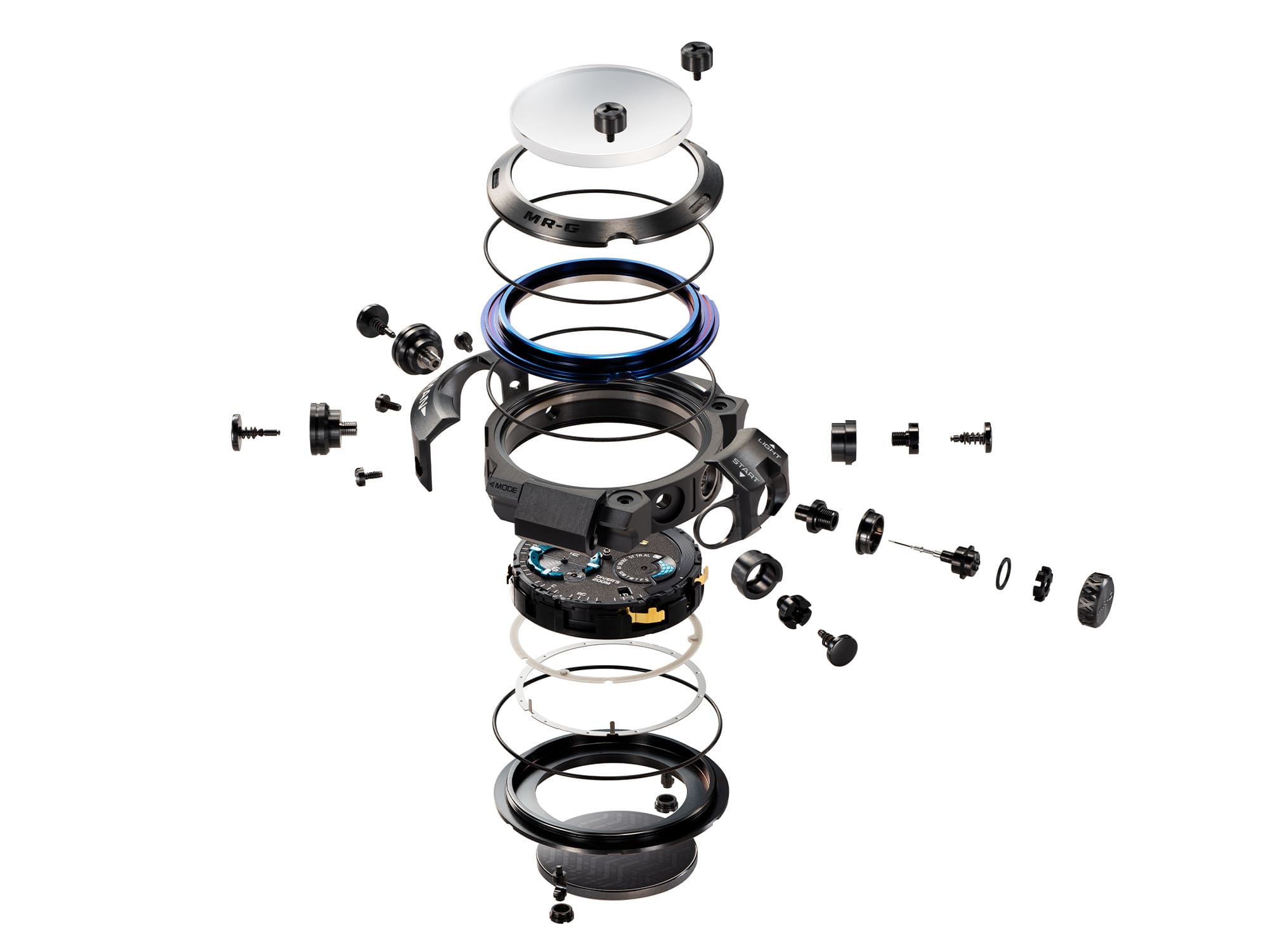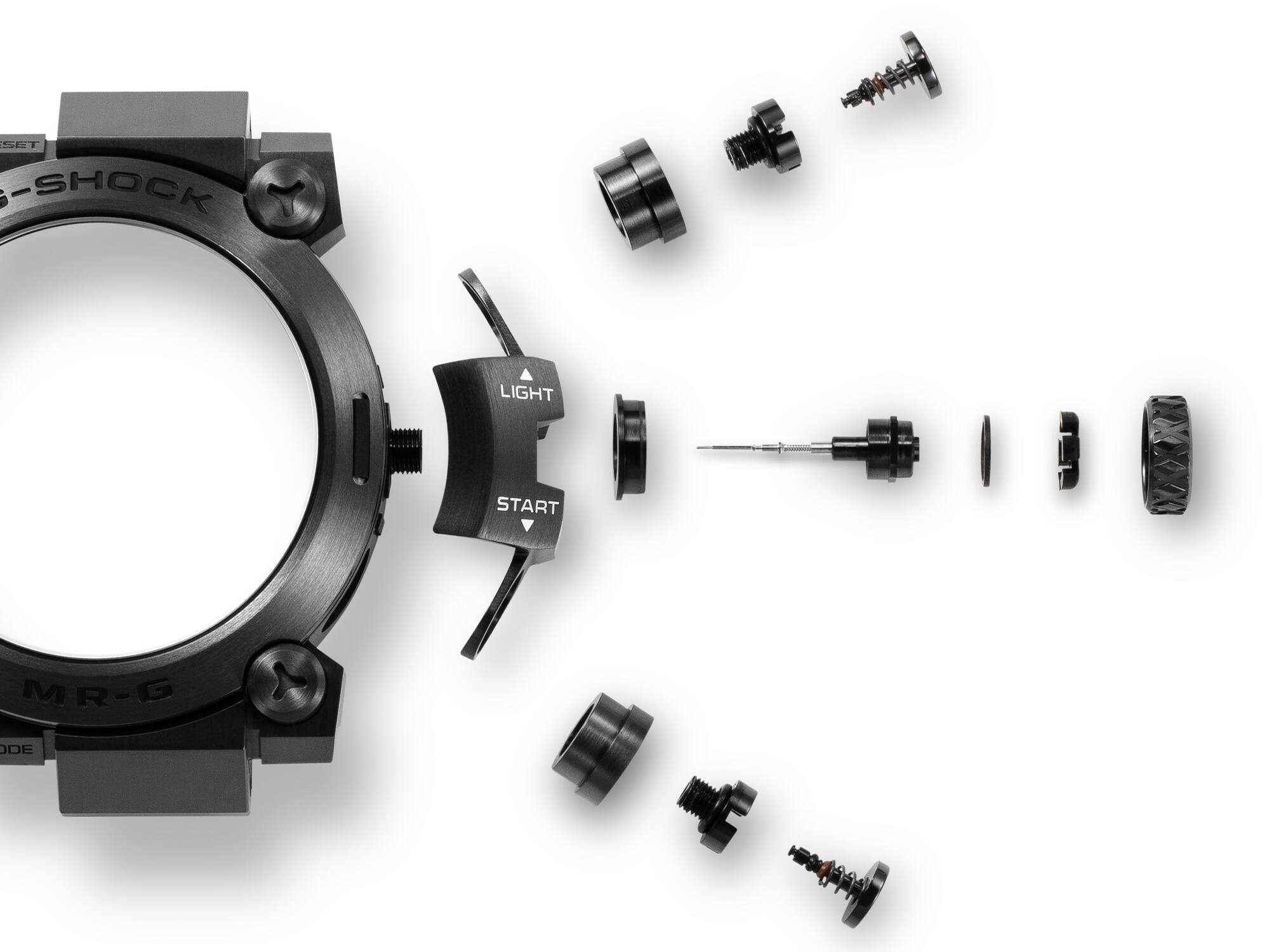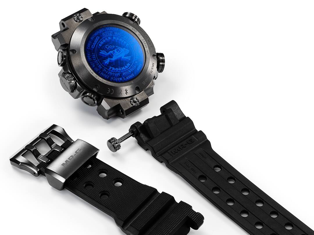 Titanium digunakan untuk kekuatan — dari komponen utama seperti casing, bezel, dan casing belakang, hingga komponen miniatur seperti mahkota, tombol, dan sekrup. Jam tangan ini terbuat dari kombinasi rumit lebih dari 70 komponen eksterior, termasuk segel tahan air cincin O dan penyangga yang memperkuat struktur tahan guncangan. Konstruksi asli ini membuatnya tahan air, kualitas yang dibutuhkan untuk jam tangan penyelam, sekaligus menciptakan bentuk menawan yang layak untuk jajaran MR-G.