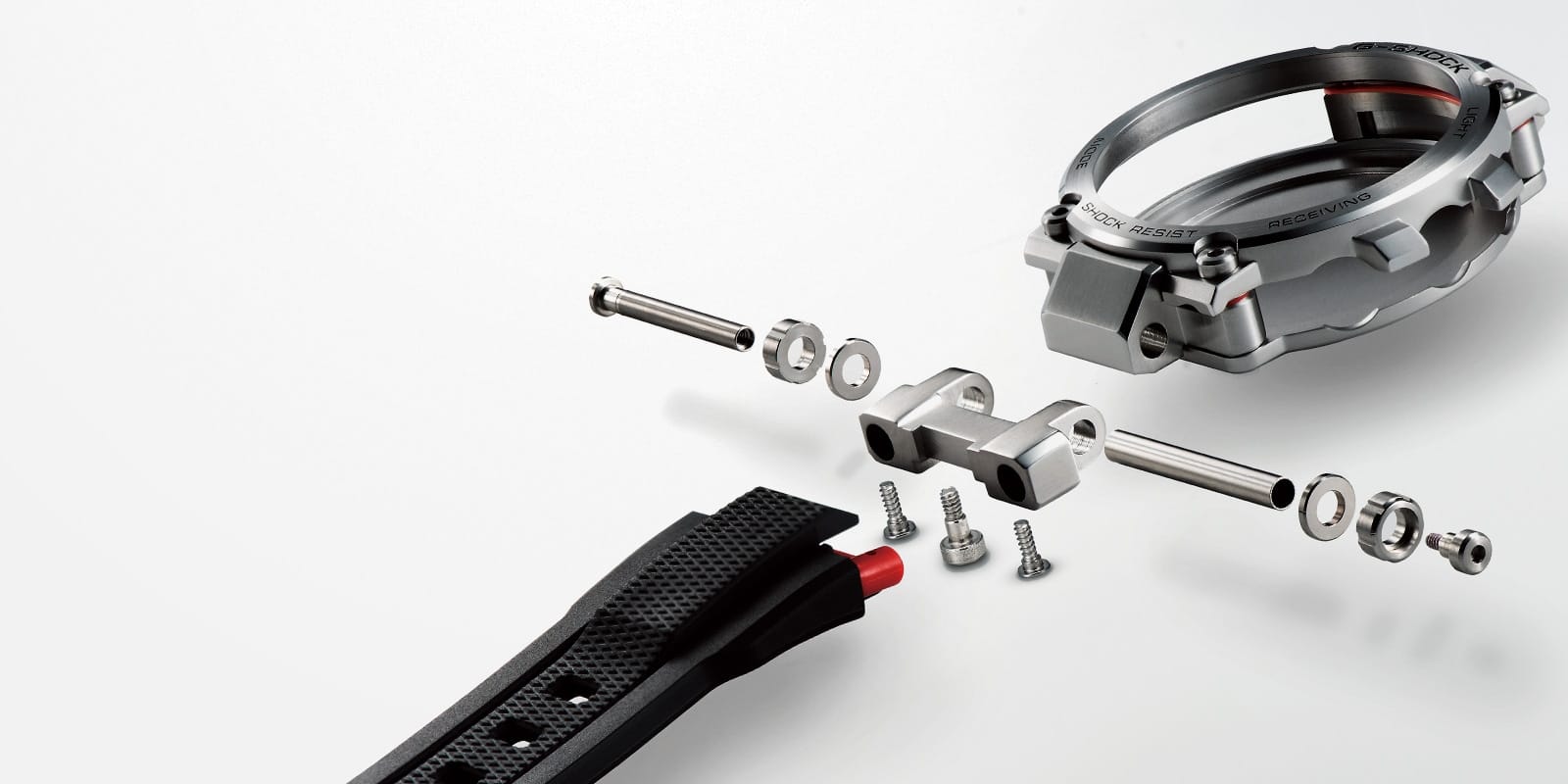 Komponen berbahan resin murni dipasang dengan sekrup ke dudukan tali jam berbahan uretan yang tebal dan lembut. Kemudian, tali itu dipasang dengan erat ke casing menggunakan komponen logam dan baut besar. Struktur kokoh yang unik dan baru dikembangkan ini memperkuat bagian sambungan yang menghubungkan komponen berbahan logam dan resin.