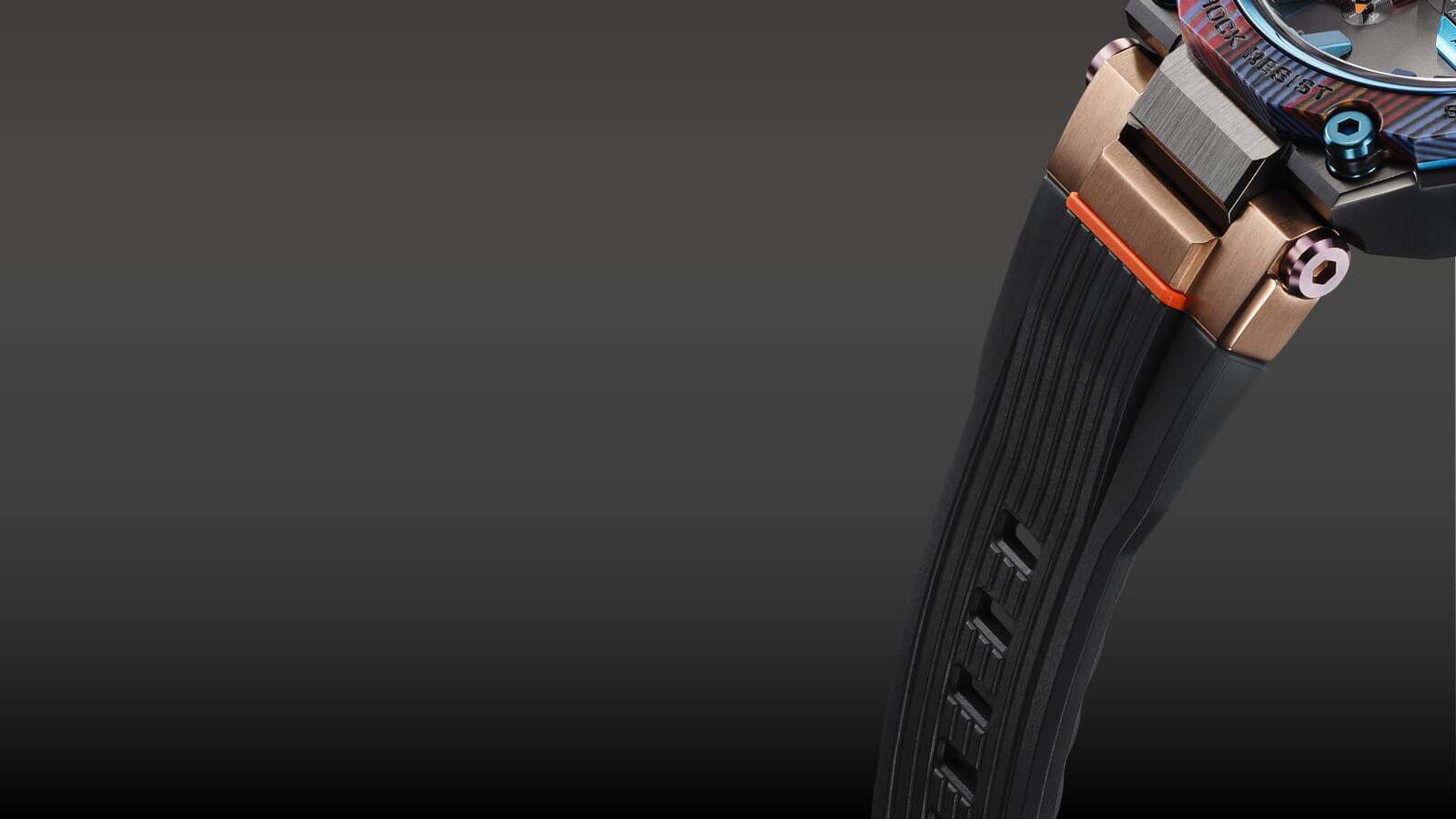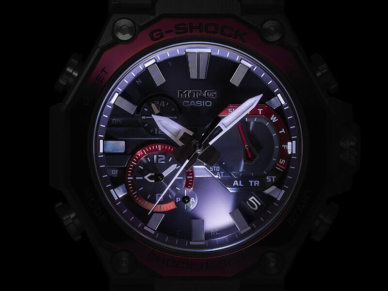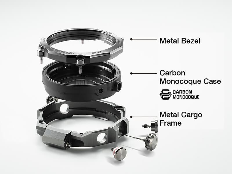 Kami memadukan struktur Metal Core Guard MT-G asli dengan Carbon Core Guard G-SHOCK terbaru. Casing monokok berbahan resin berpenguat serat karbon disematkan di dalam bingkai logam yang terhubung dengan bezel — jam jadi makin kuat, kedap udara, dan ringan.