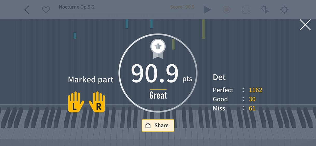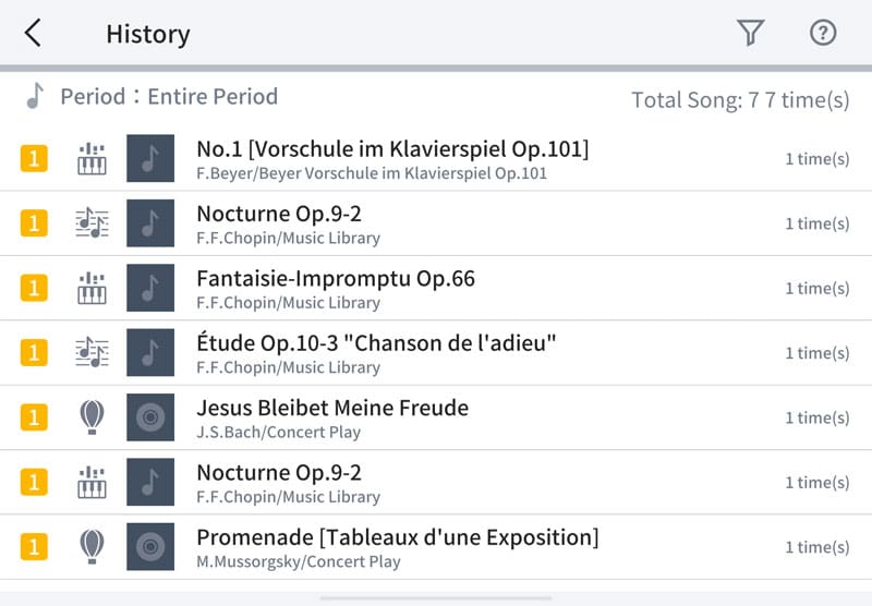 You can view the total number of times you’ve played each piece, along with detailed information related to the music.