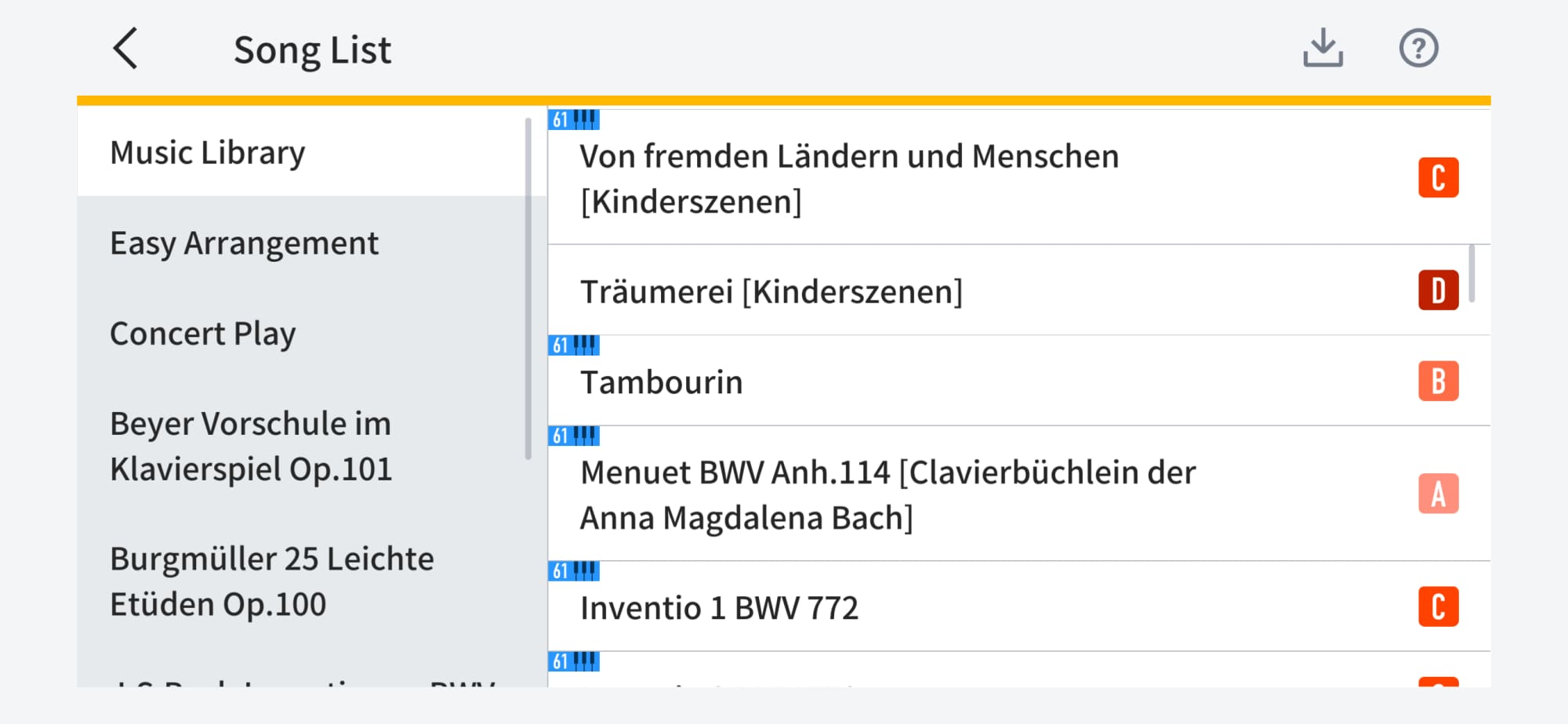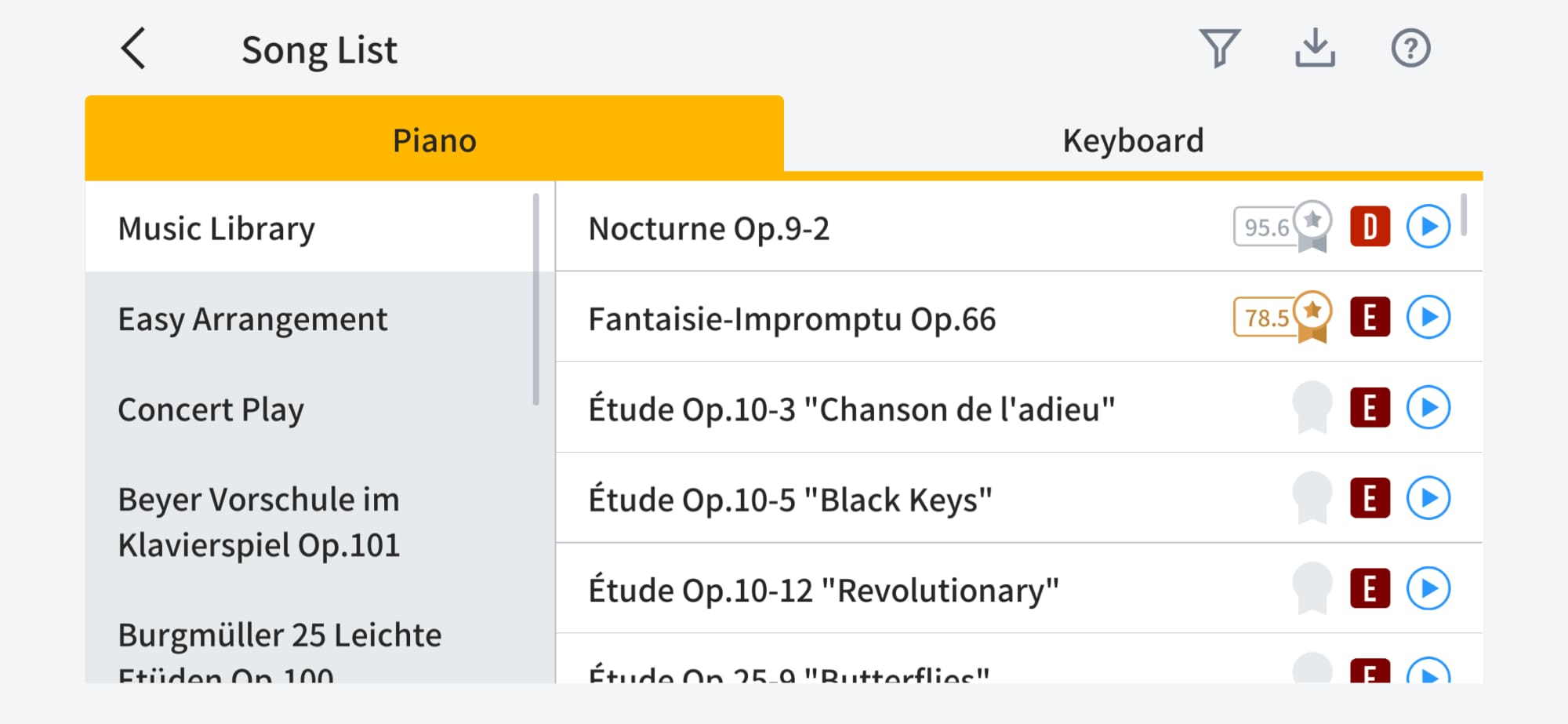 The app contains piano songs and keyboard songs for you to practice and play – and you can also use your own MIDI files. Many of the piano songs can also be played on a 61-key keyboard. In the song list, the difficulty level, scoring results and a preview button are also displayed. You can also filter the display to show only piano songs of a particular difficulty level.