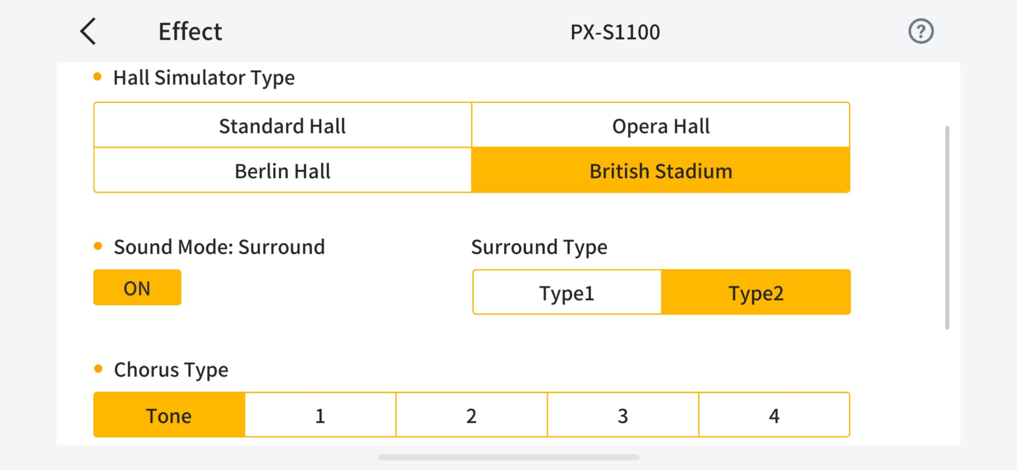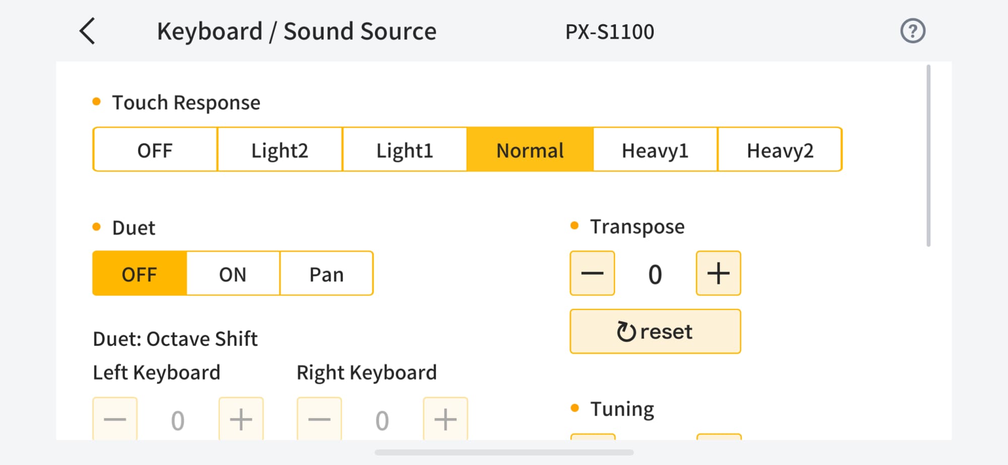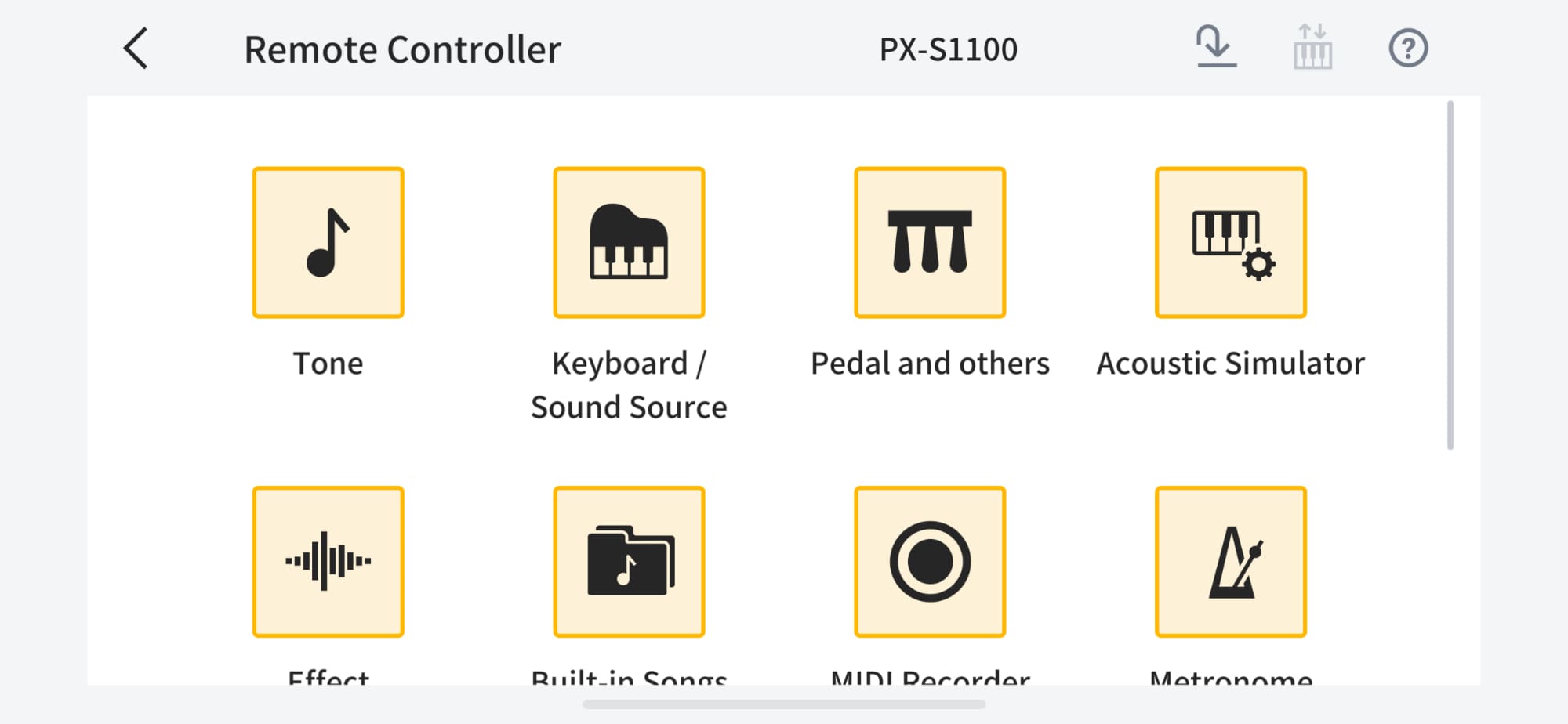 Change settings for touch response, metronome beat, tempo, effects, and more from the list of settings displayed in the app.