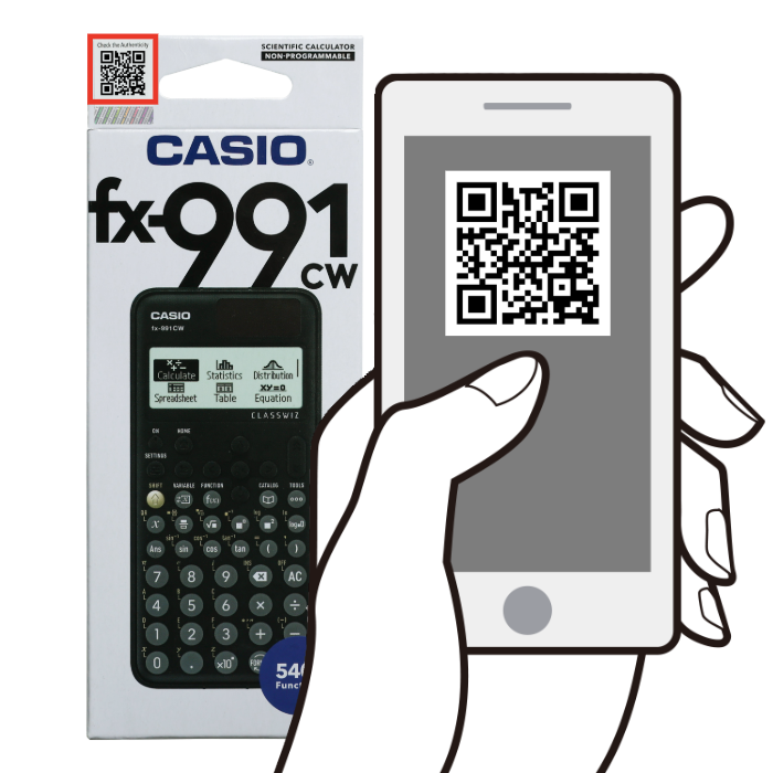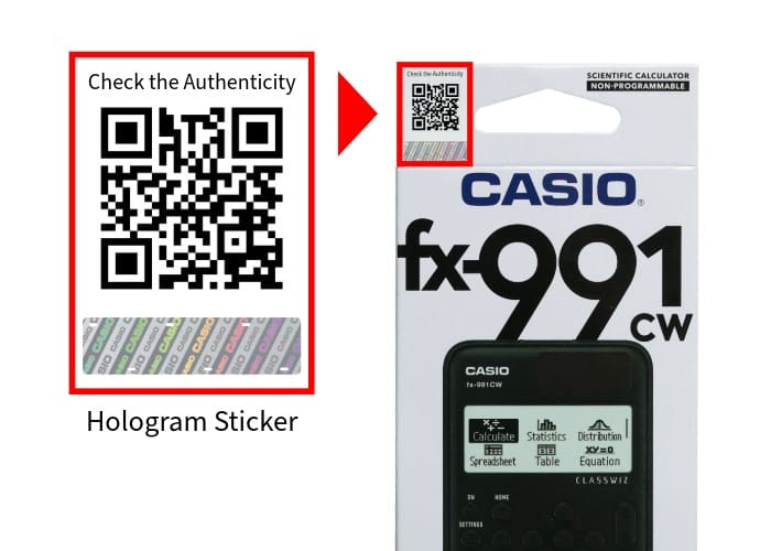 To verify the authenticity of your CASIO calculator, you have two options: with the Calculator QR Code, or with the Package QR Sticker.