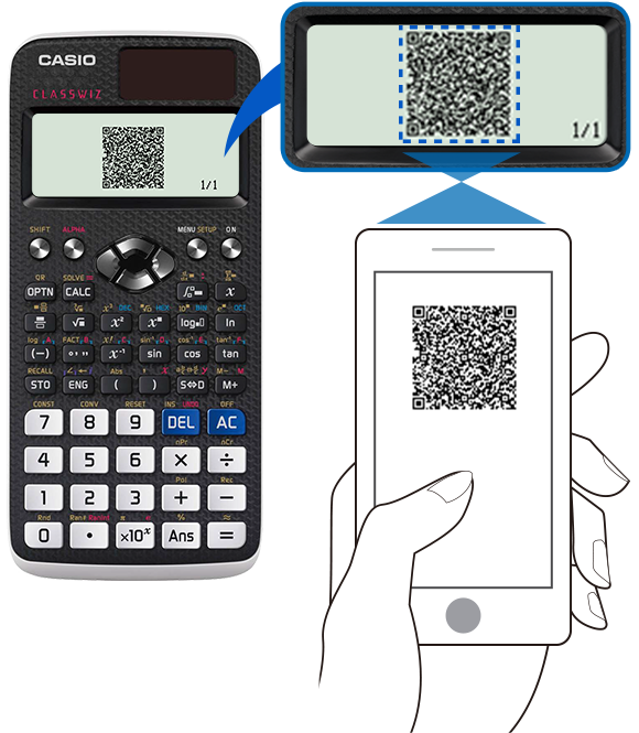 Press "ON" to power, and then "MODE", "0" to display the QR code on the calculator.