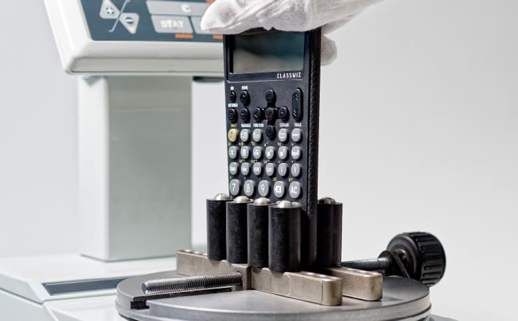 This test considers the kinds of stressors that might be placed on scientific calculators when they are pressed on by study materials or other external pressures, such as when the calculator is carried inside a bag on the way to school.
