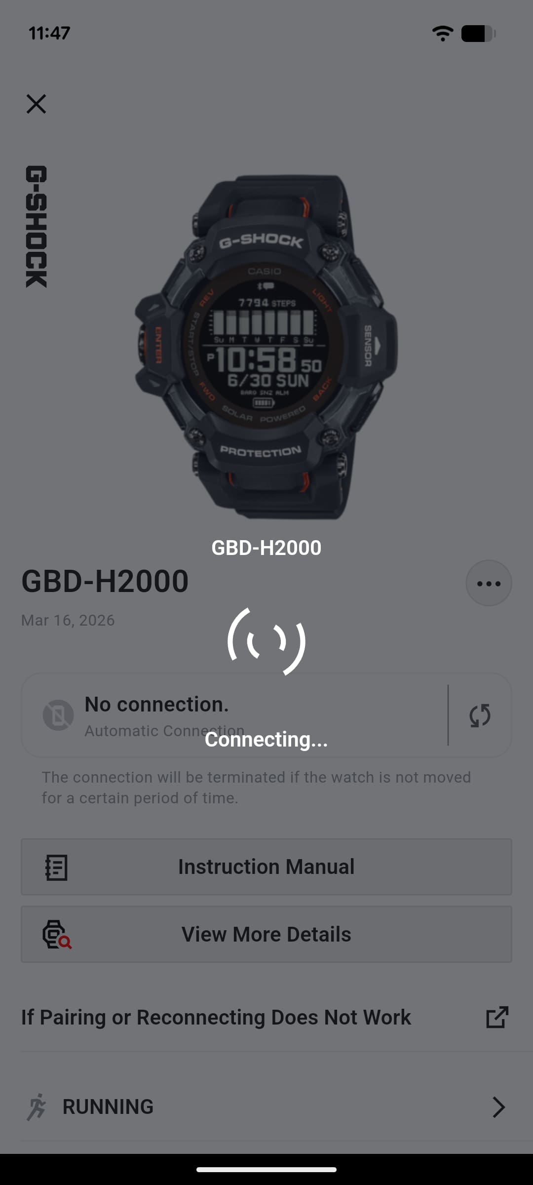 If the watch remains stationary for a certain period, the connection will be terminated and automatically reconnect when the watch is moved.