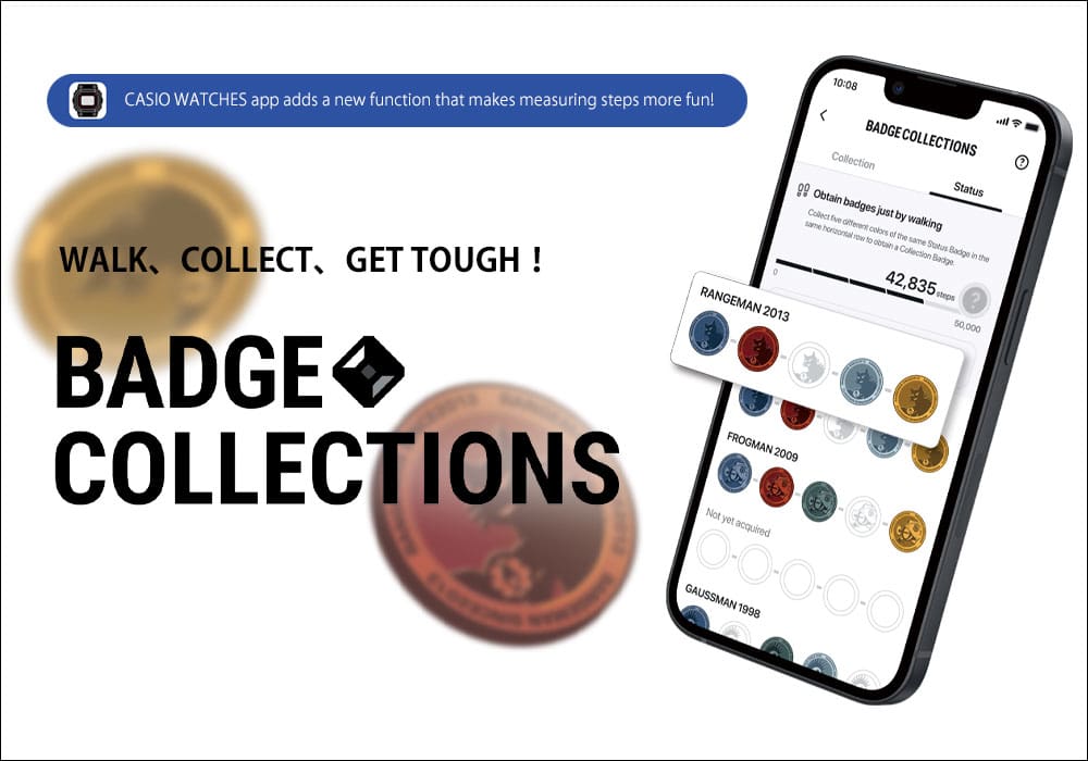 We have incorporated the "BADGE COLLECTIONS" feature to bring enjoyment to your daily steps. By connecting your step tracker-equipped watch and the CASIO WATCHES app, you can earn Casio original badges as you reach certain step milestones. We will be releasing new badges gradually, so please enjoy your watch life to the fullest!