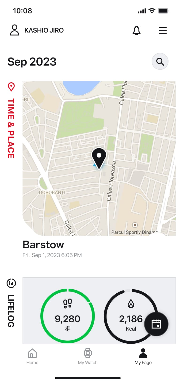 The Time & Place feature for recording activity logs is available for Bluetooth® compatible watches. Just press a button on the watch to record the time and position on a map within the app, a useful feature for keeping track of favorite locations and recording activity logs. A Life Log function is also available for certain watch models for tracking your level of activity. You can also set up a personal profile.