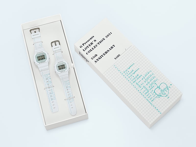 Celebrate your timeless love with limited edition matching G-SHOCK and BABY-G watches inspired by the mathematical formula for love. The G Presents Lover's Collection marks its 25th anniversary with an extra-special pair of holiday timepieces. What better symbol of romance than a one-of-a-kind design featuring the equation, x²-|x|y+y²=25, which, when plotted out, creates a heart-shaped graph symbolizing everlasting love? This unique take on the ever-popular square-faced DW-5600 and BGD-560 feature watchbands in a matte white graph paper design filled with math formulas. These equations hide a romantic secret that just you and your special someone share — align the bands to bring the two halves together to complete a single heart. A small heart accents the face to mark the light button. Press the button to reveal a backlit silhouette of a heart. The case back is engraved with the year 2021, as well as with an angel and devil, because we know how opposites attract. Packaged in a special two-watch box in white, these timepieces make an unforgettable gift. * Available only as matched sets of two watches.