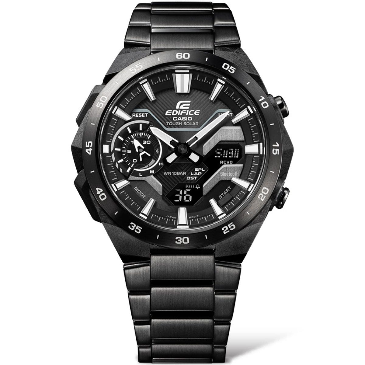 The ECB-2200P features a urethane band that offers a nice fit on the wrist and won’t impede arm motion, making it well-suited for busy pit work and more. The openings on both sides of the urethane band evoke the look of sports cars’ air vents. The ECB-2200DD and ECB-2200DC feature metal bands treated with black IP.