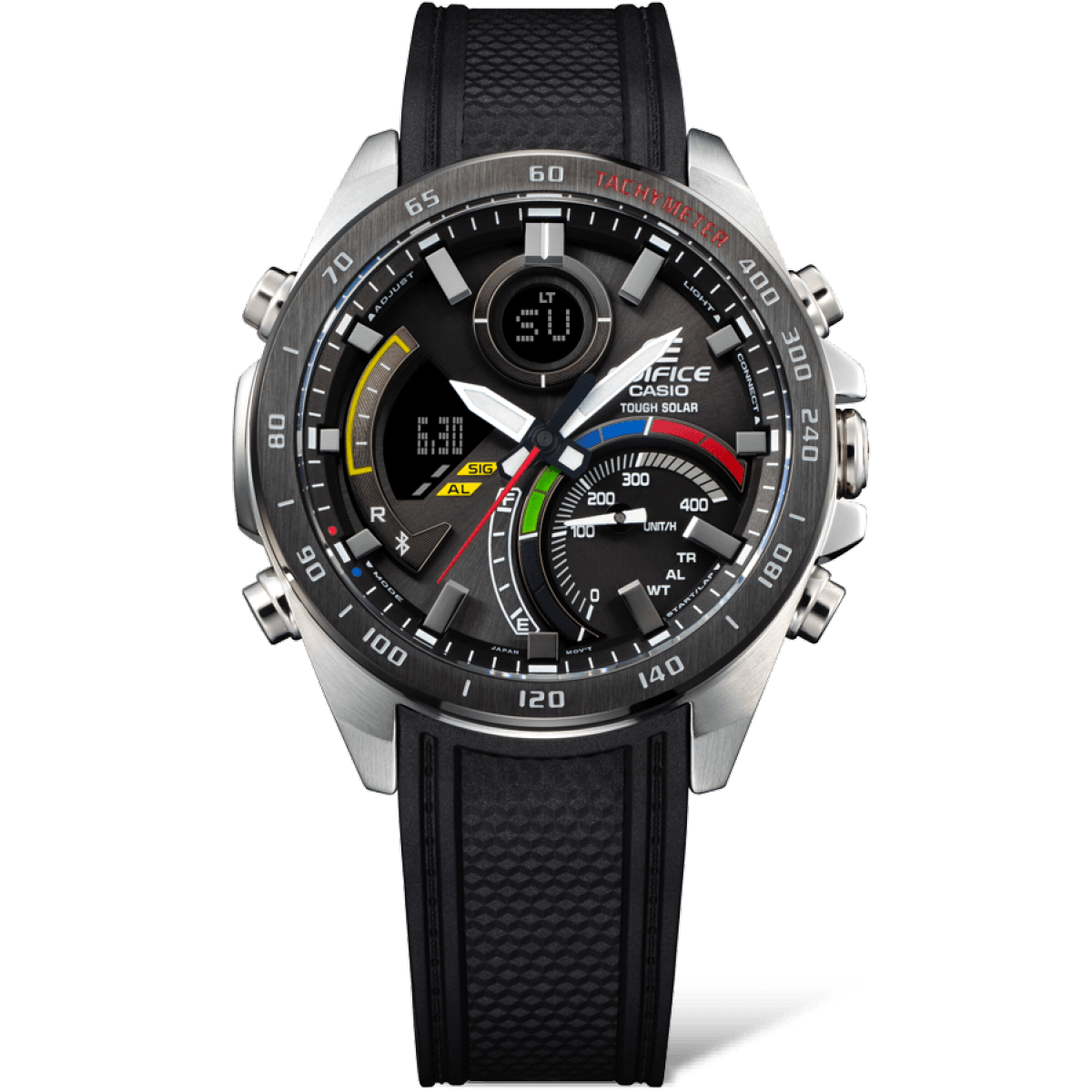 Welcome three new additions to the EDIFICE line of high-performance chronographs dedicated to delivering all-original design and functionality. These innovative multicolor watches feature a race car steering wheel motif. The dial employs a combination of colorful, high-visibility accents to ensure the clock time and stopwatch readout can be checked quickly and reliably. Each watch is also outfitted with a soft urethane band for an extremely comfortable fit. Vital specs honed onsite at the racetrack are incorporated in this innovative racing-themed design.