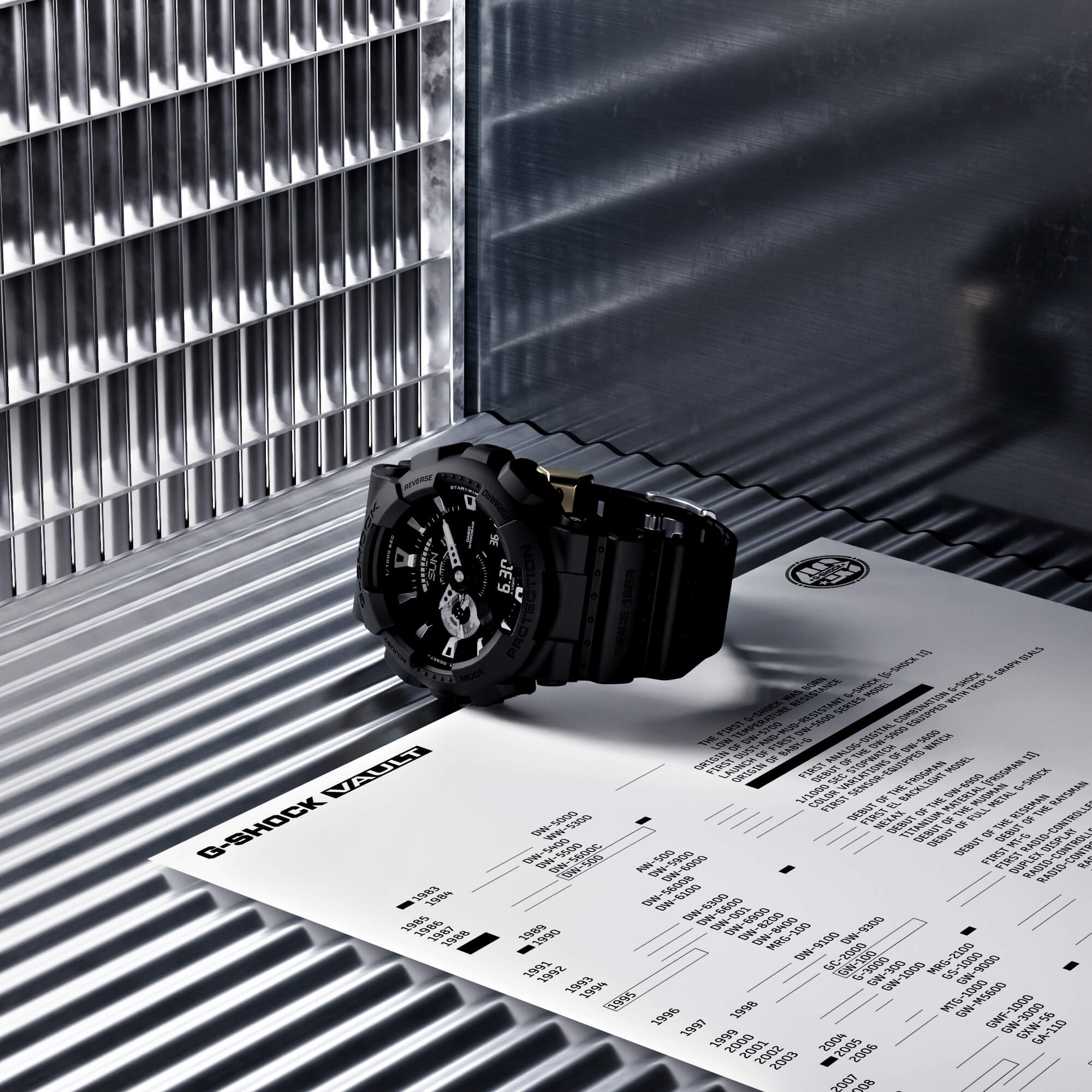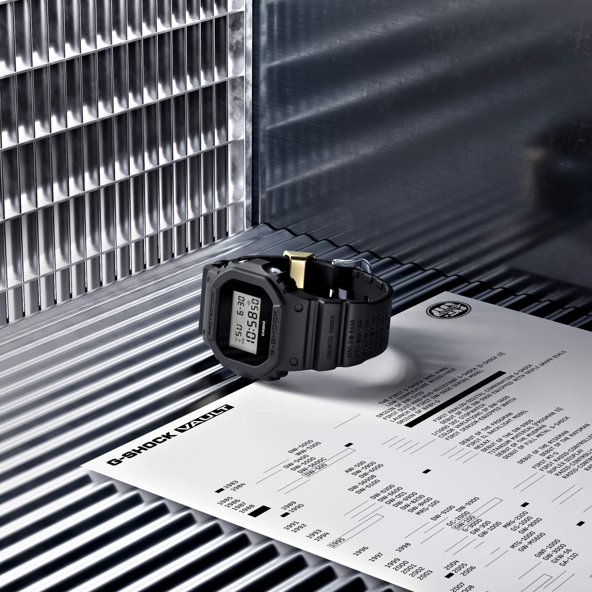 These 40th anniversary shock-resistant REMASTER BLACK timepieces feature a band imprinted with the names and launch years of past G-SHOCK milestone models. From more than 4,200 models launched over the past 40 years, Casio has chosen 49 G-SHOCK models to represent the innovative advancements in structure, function, materials, and design the brand has delivered over time. These model names are imprinted on the REMASTER BLACK band with a hot-stamping process that impresses the lettering into the band, for a textural, indented effect. The overall design is in G-SHOCK brand black accented with gold-colored stainless steel band loop.