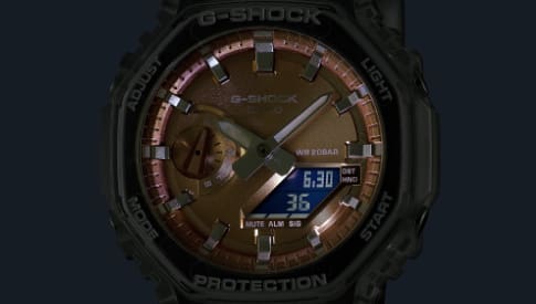 The GA-2100BM series is a must-have for anyone who wants to stand out with their style and colors. The remake of the GA-2100, the reinterpretation of the first G-SHOCK from 1983, comes in the iconic octagon shape in transparent resin. The metallic, luminous colors of the dial in delicate rose gold, cool light blue, and shiny silver are complemented by cleverly placed color accents on the sub-dials' indices. The uncluttered analog-digital dial is easy to read, even in low-light conditions, thanks to the 3D indices with a fluorescent coating that glows in the dark.