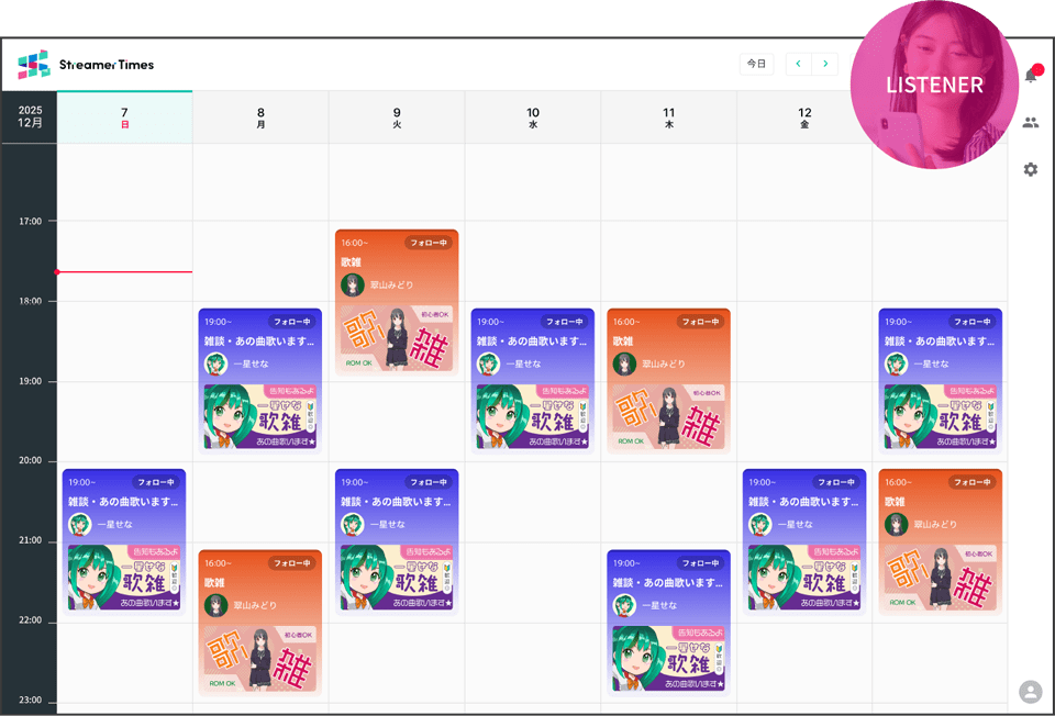 配信時間、タイトル、サムネイルなど、簡単なフォーム入力で、ライブ配信の予定をサイトに公開できます。リスナーは、見やすい番組表スタイルで配信スケジュールを閲覧可能。フォローしたストリーマーの予定を一括チェックできます。