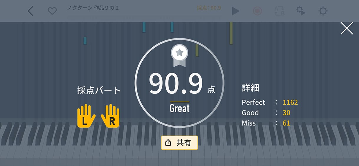 演奏をアプリが自動判定し、スコアを表示。自分の演奏のできばえを振り返ることができます。