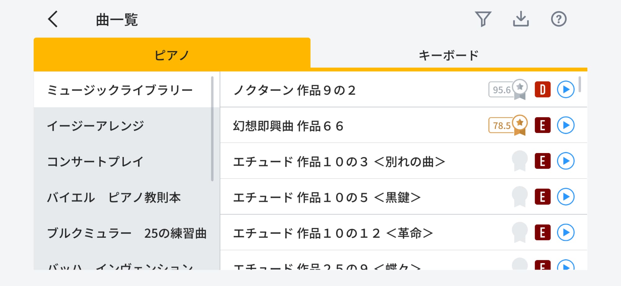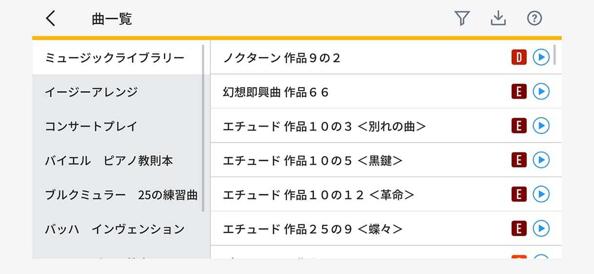 ピアノ曲とキーボード曲があり、ピアノ曲の中には、61鍵盤のキーボードで弾ける曲も数多く用意されています。お手持ちのMIDIファイルを使うこともできます。曲リストでは、難易度や採点結果、試聴ボタンも表示。ピアノ曲は任意の難易度の曲に絞り込んで表示することもできます。